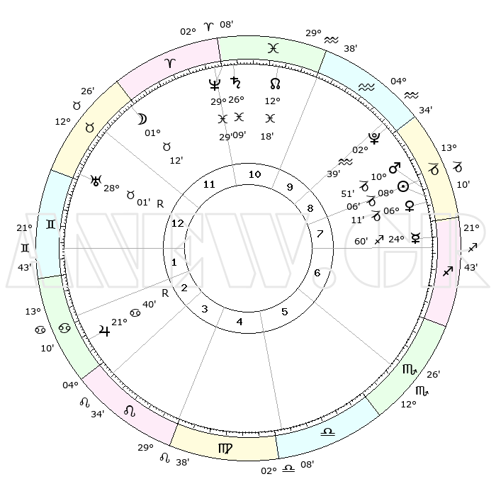 | | ΘΕΣΕΙΣ ΠΛΑΝΗΤΩΝ ΑΣΤΡΟΛΟΓΙΚΟΥ ΧΑΡΤΗ ΤΗΣ ΣΤΙΓΜΗΣ ΑΥΤΗΣ | | | | Πλανήτης | Ζώδιο | Μοίρες | Δεκαήμ. | Σε οίκο | Απόκλιση | | Ακμές των οίκων | | Ηλιος | Αιγόκερως | 08°02' | Πρώτο | 8 | 23 S 11 | | 1ος | 25°30' | Ταύρος | | Σελήνη | Ταύρος | 00°15' | Πρώτο | 12 | 15 N 09 | | 2ος | 21°15' | Δίδυμοι | | Ερμής | Τοξότης | 24°53' | Τρίτο | 8 | 23 S 37 | | 3ος | 12°51' | Καρκίνος | | Αφροδίτη | Αιγόκερως | 06°06' | Πρώτο | 8 | 23 S 42 | | 4ος | 05°19' | Λέων | | Αρης | Αιγόκερως | 10°48' | Δεύτερο | 8 | 23 S 52 | | 5ος | 03°02' | Παρθένος | | Δίας | Καρκίνος | 21°40'R | Τρίτο | 3 | 21 N 55 | | 6ος | 10°43' | Ζυγός | | Κρόνος | Ιχθείς | 26°09' | Τρίτο | 11 | 03 S 37 | | 7ος | 25°30' | Σκορπιός | | Ουρανός | Ταύρος | 28°01'R | Τρίτο | 1 | 19 N 31 | | 8ος | 21°15' | Τοξότης | | Ποσειδώνας | Ιχθείς | 29°29' | Τρίτο | 11 | 01 S 26 | | 9ος | 12°51' | Αιγόκερως | | Πλούτωνας | Υδροχόος | 02°39' | Πρώτο | 9 | 23 S 14 | | 10ος | 05°19' | Υδροχόος | | Β. Δεσμός | Ιχθείς | 12°18' | Δεύτερο | 11 | 06 S 57 | | 11ος | 03°02' | Ιχθείς | | Ωροσκόπος | Ταύρος | 25°30' | Τρίτο | | | 12ος | 10°43' | Κριός | | Μεσουράνημα | Υδροχόος | 05°19' | Πρώτο | | | |