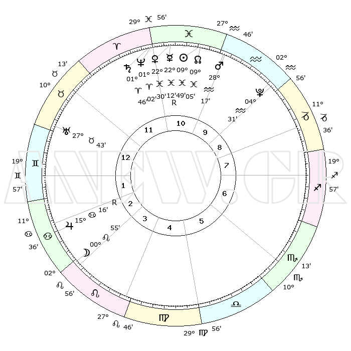 | | ΘΕΣΕΙΣ ΠΛΑΝΗΤΩΝ ΑΣΤΡΟΛΟΓΙΚΟΥ ΧΑΡΤΗ ΤΗΣ ΣΤΙΓΜΗΣ ΑΥΤΗΣ | | | | Πλανήτης | Ζώδιο | Μοίρες | Δεκαήμ. | Σε οίκο | Απόκλιση | | Ακμές των οίκων | | Ηλιος | Ιχθείς | 09°45' | Πρώτο | 11 | 07 S 55 | | 1ος | 24°31' | Ταύρος | | Σελήνη | Λέων | 00°02' | Πρώτο | 3 | 23 N 23 | | 2ος | 20°29' | Δίδυμοι | | Ερμής | Ιχθείς | 22°13'R | Τρίτο | 11 | 00 S 09 | | 3ος | 12°09' | Καρκίνος | | Αφροδίτη | Ιχθείς | 22°25' | Τρίτο | 11 | 04 S 16 | | 4ος | 04°33' | Λέων | | Αρης | Υδροχόος | 28°14' | Τρίτο | 10 | 13 S 07 | | 5ος | 02°06' | Παρθένος | | Δίας | Καρκίνος | 15°16'R | Δεύτερο | 3 | 22 N 54 | | 6ος | 09°37' | Ζυγός | | Κρόνος | Κριός | 01°46' | Πρώτο | 11 | 01 S 15 | | 7ος | 24°31' | Σκορπιός | | Ουρανός | Ταύρος | 27°43' | Τρίτο | 1 | 19 N 28 | | 8ος | 20°29' | Τοξότης | | Ποσειδώνας | Κριός | 01°02' | Πρώτο | 11 | 00 S 47 | | 9ος | 12°09' | Αιγόκερως | | Πλούτωνας | Υδροχόος | 04°31' | Πρώτο | 9 | 22 S 53 | | 10ος | 04°33' | Υδροχόος | | Β. Δεσμός | Ιχθείς | 09°05' | Πρώτο | 11 | 08 S 10 | | 11ος | 02°06' | Ιχθείς | | Ωροσκόπος | Ταύρος | 24°31' | Τρίτο | | | 12ος | 09°37' | Κριός | | Μεσουράνημα | Υδροχόος | 04°33' | Πρώτο | | | |