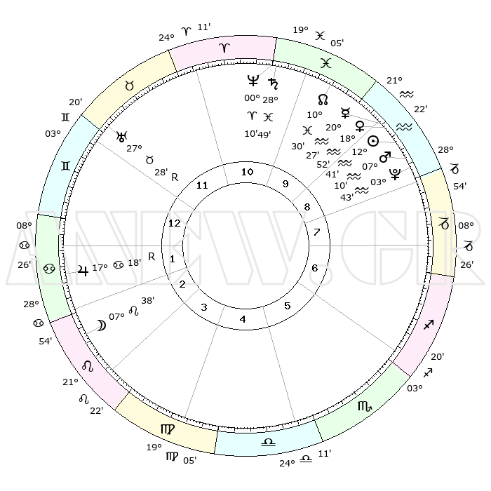 | | ΘΕΣΕΙΣ ΠΛΑΝΗΤΩΝ ΑΣΤΡΟΛΟΓΙΚΟΥ ΧΑΡΤΗ ΤΗΣ ΣΤΙΓΜΗΣ ΑΥΤΗΣ | | | | Πλανήτης | Ζώδιο | Μοίρες | Δεκαήμ. | Σε οίκο | Απόκλιση | | Ακμές των οίκων | | Ηλιος | Υδροχόος | 12°37' | Δεύτερο | 9 | 17 S 01 | | 1ος | 17°39' | Δίδυμοι | | Σελήνη | Λέων | 06°46' | Πρώτο | 3 | 21 N 17 | | 2ος | 09°34' | Καρκίνος | | Ερμής | Υδροχόος | 20°20' | Τρίτο | 9 | 16 S 28 | | 3ος | 00°51' | Λέων | | Αφροδίτη | Υδροχόος | 18°47' | Δεύτερο | 9 | 16 S 29 | | 4ος | 25°23' | Λέων | | Αρης | Υδροχόος | 07°07' | Πρώτο | 9 | 19 S 30 | | 5ος | 27°07' | Παρθένος | | Δίας | Καρκίνος | 17°18'R | Δεύτερο | 2 | 22 N 37 | | 6ος | 07°21' | Σκορπιός | | Κρόνος | Ιχθείς | 28°48' | Τρίτο | 11 | 02 S 28 | | 7ος | 17°39' | Τοξότης | | Ουρανός | Ταύρος | 27°28'R | Τρίτο | 12 | 19 N 24 | | 8ος | 09°34' | Αιγόκερως | | Ποσειδώνας | Κριός | 00°09' | Πρώτο | 11 | 01 S 09 | | 9ος | 00°51' | Υδροχόος | | Πλούτωνας | Υδροχόος | 03°43' | Πρώτο | 9 | 23 S 01 | | 10ος | 25°23' | Υδροχόος | | Β. Δεσμός | Ιχθείς | 10°30' | Δεύτερο | 10 | 07 S 38 | | 11ος | 27°07' | Ιχθείς | | Ωροσκόπος | Δίδυμοι | 17°39' | Δεύτερο | | | 12ος | 07°21' | Ταύρος | | Μεσουράνημα | Υδροχόος | 25°23' | Τρίτο | | | |