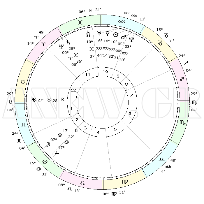 | | ΘΕΣΕΙΣ ΠΛΑΝΗΤΩΝ ΑΣΤΡΟΛΟΓΙΚΟΥ ΧΑΡΤΗ ΤΗΣ ΣΤΙΓΜΗΣ ΑΥΤΗΣ | | | | Πλανήτης | Ζώδιο | Μοίρες | Δεκαήμ. | Σε οίκο | Απόκλιση | | Ακμές των οίκων | | Ηλιος | Υδροχόος | 10°29' | Δεύτερο | 10 | 17 S 36 | | 1ος | 03°33' | Ταύρος | | Σελήνη | Καρκίνος | 06°30' | Πρώτο | 3 | 27 N 54 | | 2ος | 04°48' | Δίδυμοι | | Ερμής | Υδροχόος | 16°38' | Δεύτερο | 11 | 17 S 43 | | 3ος | 28°00' | Δίδυμοι | | Αφροδίτη | Υδροχόος | 16°10' | Δεύτερο | 11 | 17 S 16 | | 4ος | 19°43' | Καρκίνος | | Αρης | Υδροχόος | 05°28' | Πρώτο | 10 | 19 S 54 | | 5ος | 14°29' | Λέων | | Δίας | Καρκίνος | 17°32'R | Δεύτερο | 3 | 22 N 35 | | 6ος | 17°54' | Παρθένος | | Κρόνος | Ιχθείς | 28°36' | Τρίτο | 12 | 02 S 33 | | 7ος | 03°33' | Σκορπιός | | Ουρανός | Ταύρος | 27°28'R | Τρίτο | 1 | 19 N 24 | | 8ος | 04°48' | Τοξότης | | Ποσειδώνας | Κριός | 00°06' | Πρώτο | 12 | 01 S 10 | | 9ος | 28°00' | Τοξότης | | Πλούτωνας | Υδροχόος | 03°39' | Πρώτο | 10 | 23 S 02 | | 10ος | 19°43' | Αιγόκερως | | Β. Δεσμός | Ιχθείς | 10°37' | Δεύτερο | 11 | 07 S 35 | | 11ος | 14°29' | Υδροχόος | | Ωροσκόπος | Ταύρος | 03°33' | Πρώτο | | | 12ος | 17°54' | Ιχθείς | | Μεσουράνημα | Αιγόκερως | 19°43' | Δεύτερο | | | |