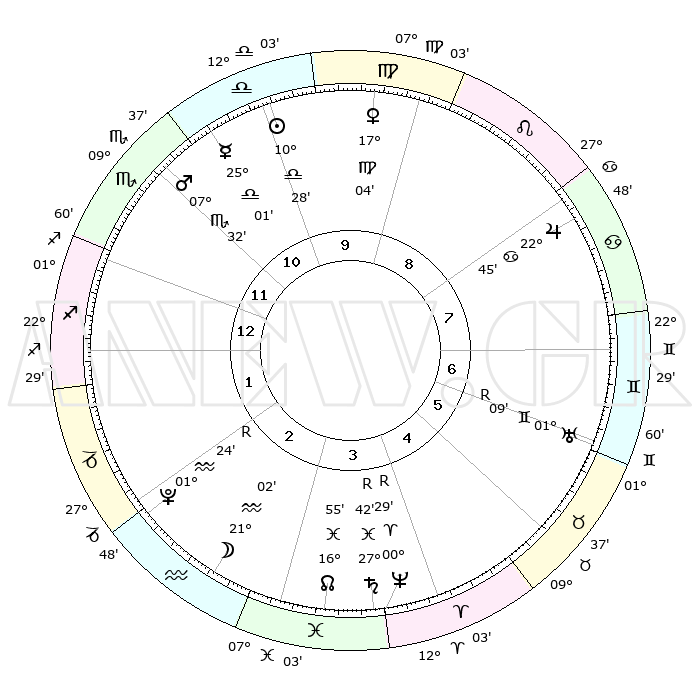 | ΘΕΣΕΙΣ ΠΛΑΝΗΤΩΝ ΑΣΤΡΟΛΟΓΙΚΟΥ ΧΑΡΤΗ ΤΗΣ ΣΤΙΓΜΗΣ ΑΥΤΗΣ | | Πλανήτης | Ζώδιο | Μοίρες | Δεκαήμ. | Σε οίκο | Απόκλιση | | Ακμές των οίκων | Ηλιος | Ζυγός | 10°24' | Δεύτερο | 10 | 04 S 07 | | 1ος | 01°03' | Τοξότης | Σελήνη | Υδροχόος | 20°05' | Τρίτο | 3 | 17 S 08 | | 2ος | 02°20' | Αιγόκερως | Ερμής | Ζυγός | 24°54' | Τρίτο | 11 | 10 S 00 | | 3ος | 08°13' | Υδροχόος | Αφροδίτη | Παρθένος | 16°59' | Δεύτερο | 10 | 06 N 22 | | 4ος | 14°17' | Ιχθείς | Αρης | Σκορπιός | 07°29' | Πρώτο | 11 | 14 S 06 | | 5ος | 15°11' | Κριός | Δίας | Καρκίνος | 22°45' | Τρίτο | 8 | 21 N 32 | | 6ος | 10°05' | Ταύρος | Κρόνος | Ιχθείς | 27°43'R | Τρίτο | 4 | 03 S 13 | | 7ος | 01°03' | Δίδυμοι | Ουρανός | Δίδυμοι | 01°09'R | Πρώτο | 7 | 20 N 11 | | 8ος | 02°20' | Καρκίνος | Ποσειδώνας | Κριός | 00°29'R | Πρώτο | 4 | 01 S 04 | | 9ος | 08°13' | Λέων | Πλούτωνας | Υδροχόος | 01°24'R | Πρώτο | 2 | 23 S 32 | | 10ος | 14°17' | Παρθένος | Β. Δεσμός | Ιχθείς | 16°55' | Δεύτερο | 4 | 05 S 10 | | 11ος | 15°11' | Ζυγός | Ωροσκόπος | Τοξότης | 01°03' | Πρώτο | | | 12ος | 10°05' | Σκορπιός | Μεσουράνημα | Παρθένος | 14°17' | Δεύτερο | | | |