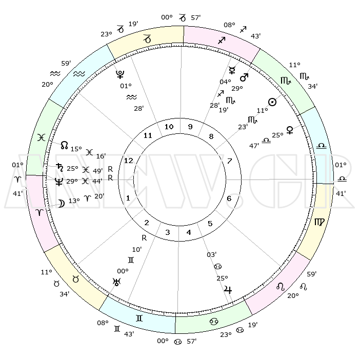 | | ΘΕΣΕΙΣ ΠΛΑΝΗΤΩΝ ΑΣΤΡΟΛΟΓΙΚΟΥ ΧΑΡΤΗ ΤΗΣ ΣΤΙΓΜΗΣ ΑΥΤΗΣ | | | | Πλανήτης | Ζώδιο | Μοίρες | Δεκαήμ. | Σε οίκο | Απόκλιση | | Ακμές των οίκων | | Ηλιος | Σκορπιός | 11°06' | Δεύτερο | 12 | 15 S 09 | | 1ος | 01°39' | Τοξότης | | Σελήνη | Κριός | 09°04' | Πρώτο | 4 | 05 N 22 | | 2ος | 03°00' | Αιγόκερως | | Ερμής | Τοξότης | 04°16' | Πρώτο | 1 | 23 S 49 | | 3ος | 08°59' | Υδροχόος | | Αφροδίτη | Ζυγός | 25°25' | Τρίτο | 11 | 08 S 29 | | 4ος | 15°03' | Ιχθείς | | Αρης | Σκορπιός | 29°06' | Τρίτο | 12 | 20 S 21 | | 5ος | 15°53' | Κριός | | Δίας | Καρκίνος | 25°02' | Τρίτο | 8 | 21 N 12 | | 6ος | 10°43' | Ταύρος | | Κρόνος | Ιχθείς | 25°49'R | Τρίτο | 4 | 03 S 55 | | 7ος | 01°39' | Δίδυμοι | | Ουρανός | Δίδυμοι | 00°11'R | Πρώτο | 6 | 19 N 59 | | 8ος | 03°00' | Καρκίνος | | Ποσειδώνας | Ιχθείς | 29°45'R | Τρίτο | 4 | 01 S 21 | | 9ος | 08°59' | Λέων | | Πλούτωνας | Υδροχόος | 01°28' | Πρώτο | 2 | 23 S 30 | | 10ος | 15°03' | Παρθένος | | Β. Δεσμός | Ιχθείς | 15°17' | Δεύτερο | 4 | 05 S 48 | | 11ος | 15°53' | Ζυγός | | Ωροσκόπος | Τοξότης | 01°39' | Πρώτο | | | 12ος | 10°43' | Σκορπιός | | Μεσουράνημα | Παρθένος | 15°03' | Δεύτερο | | | |