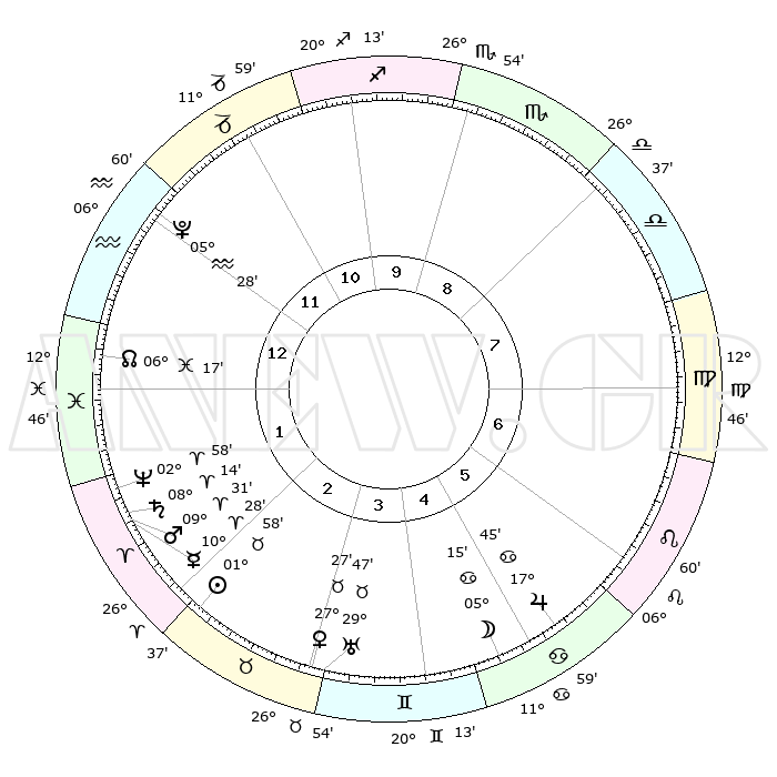 | | ΘΕΣΕΙΣ ΠΛΑΝΗΤΩΝ ΑΣΤΡΟΛΟΓΙΚΟΥ ΧΑΡΤΗ ΤΗΣ ΣΤΙΓΜΗΣ ΑΥΤΗΣ | | | | Πλανήτης | Ζώδιο | Μοίρες | Δεκαήμ. | Σε οίκο | Απόκλιση | | Ακμές των οίκων | | Ηλιος | Ταύρος | 01°53' | Πρώτο | 3 | 12 N 08 | | 1ος | 03°31' | Υδροχόος | | Σελήνη | Καρκίνος | 04°08' | Πρώτο | 5 | 27 N 56 | | 2ος | 18°10' | Ιχθείς | | Ερμής | Κριός | 10°21' | Δεύτερο | 2 | 01 N 44 | | 3ος | 26°02' | Κριός | | Αφροδίτη | Ταύρος | 27°22' | Τρίτο | 4 | 20 N 03 | | 4ος | 23°54' | Ταύρος | | Αρης | Κριός | 09°27' | Πρώτο | 2 | 02 N 53 | | 5ος | 16°25' | Δίδυμοι | | Δίας | Καρκίνος | 17°45' | Δεύτερο | 6 | 22 N 38 | | 6ος | 07°59' | Καρκίνος | | Κρόνος | Κριός | 08°13' | Πρώτο | 2 | 01 N 17 | | 7ος | 03°31' | Λέων | | Ουρανός | Ταύρος | 29°47' | Τρίτο | 4 | 19 N 56 | | 8ος | 18°10' | Παρθένος | | Ποσειδώνας | Κριός | 02°58' | Πρώτο | 2 | 00 S 02 | | 9ος | 26°02' | Ζυγός | | Πλούτωνας | Υδροχόος | 05°28' | Πρώτο | 1 | 22 S 48 | | 10ος | 23°54' | Σκορπιός | | Β. Δεσμός | Ιχθείς | 06°18' | Πρώτο | 1 | 09 S 12 | | 11ος | 16°25' | Τοξότης | | Ωροσκόπος | Υδροχόος | 03°31' | Πρώτο | | | 12ος | 07°59' | Αιγόκερως | | Μεσουράνημα | Σκορπιός | 23°54' | Τρίτο | | | |