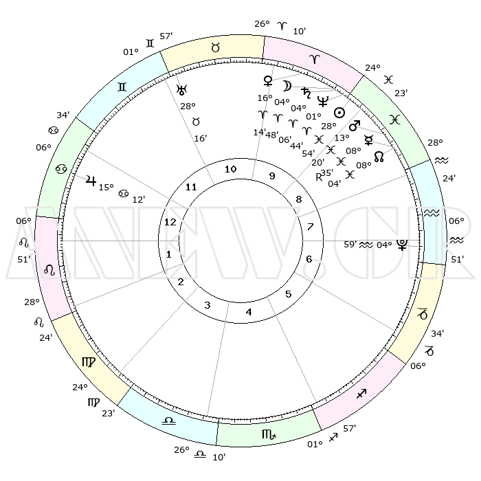 | | ΘΕΣΕΙΣ ΠΛΑΝΗΤΩΝ ΑΣΤΡΟΛΟΓΙΚΟΥ ΧΑΡΤΗ ΤΗΣ ΣΤΙΓΜΗΣ ΑΥΤΗΣ | | | | Πλανήτης | Ζώδιο | Μοίρες | Δεκαήμ. | Σε οίκο | Απόκλιση | | Ακμές των οίκων | | Ηλιος | Ιχθείς | 28°50' | Τρίτο | 9 | 00 S 28 | | 1ος | 17°11' | Καρκίνος | | Σελήνη | Κριός | 03°51' | Πρώτο | 10 | 03 N 34 | | 2ος | 07°39' | Λέων | | Ερμής | Ιχθείς | 08°35'R | Πρώτο | 9 | 07 S 07 | | 3ος | 01°03' | Παρθένος | | Αφροδίτη | Κριός | 16°09' | Δεύτερο | 10 | 05 N 30 | | 4ος | 00°13' | Ζυγός | | Αρης | Ιχθείς | 13°17' | Δεύτερο | 9 | 07 S 34 | | 5ος | 06°05' | Σκορπιός | | Δίας | Καρκίνος | 15°12' | Δεύτερο | 12 | 22 N 56 | | 6ος | 13°56' | Τοξότης | | Κρόνος | Κριός | 04°06' | Πρώτο | 10 | 00 S 19 | | 7ος | 17°11' | Αιγόκερως | | Ουρανός | Ταύρος | 28°16' | Τρίτο | 11 | 19 N 36 | | 8ος | 07°39' | Υδροχόος | | Ποσειδώνας | Κριός | 01°44' | Πρώτο | 10 | 00 S 31 | | 9ος | 01°03' | Ιχθείς | | Πλούτωνας | Υδροχόος | 04°59' | Πρώτο | 7 | 22 S 49 | | 10ος | 00°13' | Κριός | | Β. Δεσμός | Ιχθείς | 08°04' | Πρώτο | 9 | 08 S 33 | | 11ος | 06°05' | Ταύρος | | Ωροσκόπος | Καρκίνος | 17°11' | Δεύτερο | | | 12ος | 13°56' | Δίδυμοι | | Μεσουράνημα | Κριός | 00°13' | Πρώτο | | | |