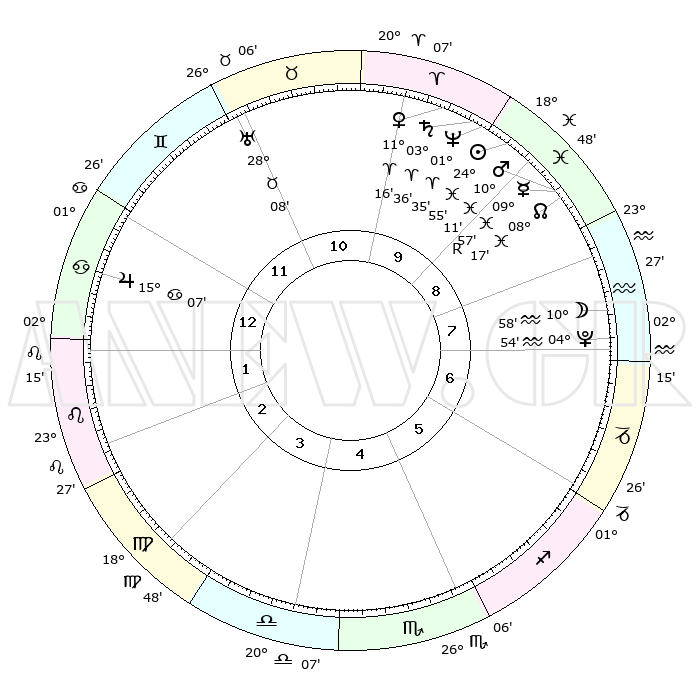 | | ΘΕΣΕΙΣ ΠΛΑΝΗΤΩΝ ΑΣΤΡΟΛΟΓΙΚΟΥ ΧΑΡΤΗ ΤΗΣ ΣΤΙΓΜΗΣ ΑΥΤΗΣ | | | | Πλανήτης | Ζώδιο | Μοίρες | Δεκαήμ. | Σε οίκο | Απόκλιση | | Ακμές των οίκων | | Ηλιος | Ιχθείς | 24°52' | Τρίτο | 9 | 02 S 02 | | 1ος | 14°55' | Καρκίνος | | Σελήνη | Υδροχόος | 10°13' | Δεύτερο | 8 | 20 S 07 | | 2ος | 05°21' | Λέων | | Ερμής | Ιχθείς | 09°59'R | Πρώτο | 9 | 05 S 41 | | 3ος | 28°30' | Λέων | | Αφροδίτη | Κριός | 11°11' | Δεύτερο | 10 | 03 N 29 | | 4ος | 27°17' | Παρθένος | | Αρης | Ιχθείς | 10°08' | Δεύτερο | 9 | 08 S 46 | | 5ος | 03°00' | Σκορπιός | | Δίας | Καρκίνος | 15°07' | Δεύτερο | 1 | 22 N 56 | | 6ος | 11°13' | Τοξότης | | Κρόνος | Κριός | 03°36' | Πρώτο | 10 | 00 S 31 | | 7ος | 14°55' | Αιγόκερως | | Ουρανός | Ταύρος | 28°08' | Τρίτο | 11 | 19 N 34 | | 8ος | 05°21' | Υδροχόος | | Ποσειδώνας | Κριός | 01°35' | Πρώτο | 10 | 00 S 34 | | 9ος | 28°30' | Υδροχόος | | Πλούτωνας | Υδροχόος | 04°54' | Πρώτο | 7 | 22 S 49 | | 10ος | 27°17' | Ιχθείς | | Β. Δεσμός | Ιχθείς | 08°17' | Πρώτο | 9 | 08 S 28 | | 11ος | 03°00' | Ταύρος | | Ωροσκόπος | Καρκίνος | 14°55' | Δεύτερο | | | 12ος | 11°13' | Δίδυμοι | | Μεσουράνημα | Ιχθείς | 27°17' | Τρίτο | | | |