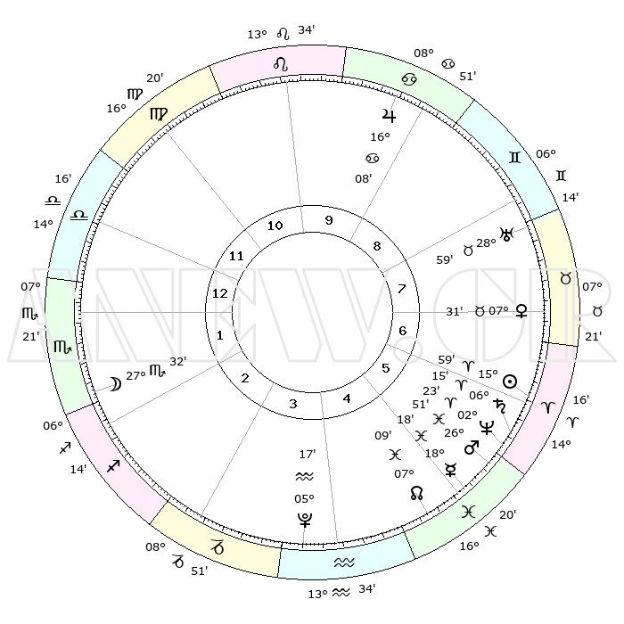 | | ΘΕΣΕΙΣ ΠΛΑΝΗΤΩΝ ΑΣΤΡΟΛΟΓΙΚΟΥ ΧΑΡΤΗ ΤΗΣ ΣΤΙΓΜΗΣ ΑΥΤΗΣ | | | | Πλανήτης | Ζώδιο | Μοίρες | Δεκαήμ. | Σε οίκο | Απόκλιση | | Ακμές των οίκων | | Ηλιος | Κριός | 15°55' | Δεύτερο | 7 | 06 N 15 | | 1ος | 14°03' | Ζυγός | | Σελήνη | Σκορπιός | 26°34' | Τρίτο | 2 | 24 S 18 | | 2ος | 11°32' | Σκορπιός | | Ερμής | Ιχθείς | 18°13' | Δεύτερο | 5 | 06 S 26 | | 3ος | 12°32' | Τοξότης | | Αφροδίτη | Ταύρος | 07°25' | Πρώτο | 7 | 13 N 45 | | 4ος | 15°52' | Αιγόκερως | | Αρης | Ιχθείς | 26°48' | Τρίτο | 6 | 02 S 13 | | 5ος | 18°48' | Υδροχόος | | Δίας | Καρκίνος | 16°07' | Δεύτερο | 10 | 22 N 50 | | 6ος | 18°36' | Ιχθείς | | Κρόνος | Κριός | 06°15' | Πρώτο | 6 | 00 N 31 | | 7ος | 14°03' | Κριός | | Ουρανός | Ταύρος | 28°58' | Τρίτο | 8 | 19 N 45 | | 8ος | 11°32' | Ταύρος | | Ποσειδώνας | Κριός | 02°23' | Πρώτο | 6 | 00 S 15 | | 9ος | 12°32' | Δίδυμοι | | Πλούτωνας | Υδροχόος | 05°17' | Πρώτο | 4 | 22 S 47 | | 10ος | 15°52' | Καρκίνος | | Β. Δεσμός | Ιχθείς | 07°09' | Πρώτο | 5 | 08 S 53 | | 11ος | 18°48' | Λέων | | Ωροσκόπος | Ζυγός | 14°03' | Δεύτερο | | | 12ος | 18°36' | Παρθένος | | Μεσουράνημα | Καρκίνος | 15°52' | Δεύτερο | | | |
