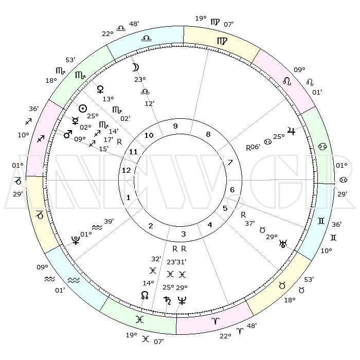 | | ΘΕΣΕΙΣ ΠΛΑΝΗΤΩΝ ΑΣΤΡΟΛΟΓΙΚΟΥ ΧΑΡΤΗ ΤΗΣ ΣΤΙΓΜΗΣ ΑΥΤΗΣ | | | | Πλανήτης | Ζώδιο | Μοίρες | Δεκαήμ. | Σε οίκο | Απόκλιση | | Ακμές των οίκων | | Ηλιος | Σκορπιός | 25°09' | Τρίτο | 12 | 19 S 03 | | 1ος | 08°50' | Τοξότης | | Σελήνη | Ζυγός | 22°21' | Τρίτο | 10 | 11 S 28 | | 2ος | 11°21' | Αιγόκερως | | Ερμής | Τοξότης | 02°22'R | Πρώτο | 12 | 21 S 08 | | 3ος | 18°33' | Υδροχόος | | Αφροδίτη | Σκορπιός | 12°57' | Δεύτερο | 11 | 14 S 38 | | 4ος | 24°35' | Ιχθείς | | Αρης | Τοξότης | 09°12' | Πρώτο | 1 | 22 S 22 | | 5ος | 24°23' | Κριός | | Δίας | Καρκίνος | 25°06'R | Τρίτο | 8 | 21 N 14 | | 6ος | 18°16' | Ταύρος | | Κρόνος | Ιχθείς | 25°23'R | Τρίτο | 4 | 04 S 03 | | 7ος | 08°50' | Δίδυμοι | | Ουρανός | Ταύρος | 29°37'R | Τρίτο | 6 | 19 N 52 | | 8ος | 11°21' | Καρκίνος | | Ποσειδώνας | Ιχθείς | 29°31'R | Τρίτο | 4 | 01 S 26 | | 9ος | 18°33' | Λέων | | Πλούτωνας | Υδροχόος | 01°39' | Πρώτο | 2 | 23 S 28 | | 10ος | 24°35' | Παρθένος | | Β. Δεσμός | Ιχθείς | 14°32' | Δεύτερο | 3 | 06 S 05 | | 11ος | 24°23' | Ζυγός | | Ωροσκόπος | Τοξότης | 08°50' | Πρώτο | | | 12ος | 18°16' | Σκορπιός | | Μεσουράνημα | Παρθένος | 24°35' | Τρίτο | | | |