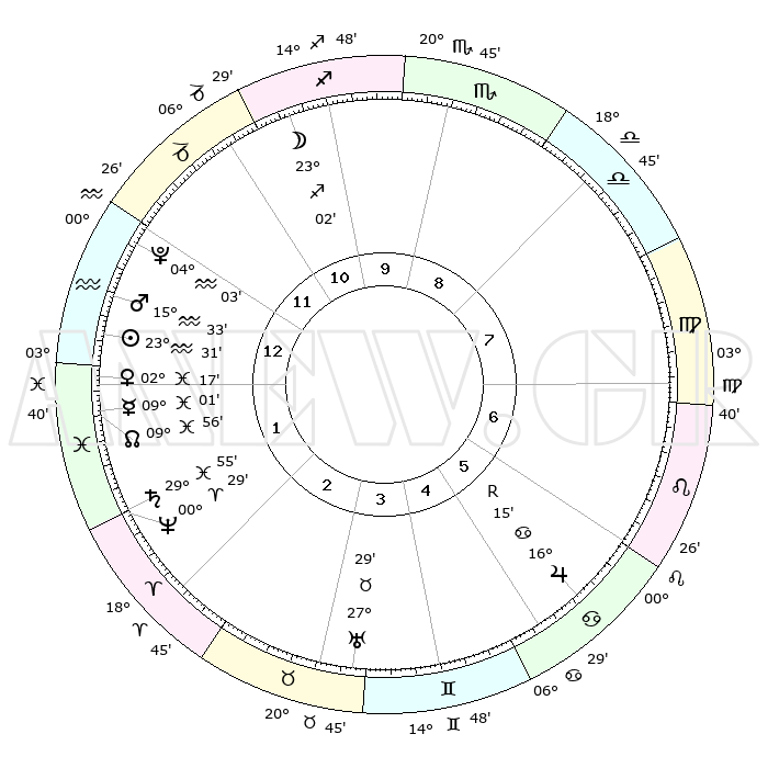 | | ΘΕΣΕΙΣ ΠΛΑΝΗΤΩΝ ΑΣΤΡΟΛΟΓΙΚΟΥ ΧΑΡΤΗ ΤΗΣ ΣΤΙΓΜΗΣ ΑΥΤΗΣ | | | | Πλανήτης | Ζώδιο | Μοίρες | Δεκαήμ. | Σε οίκο | Απόκλιση | | Ακμές των οίκων | | Ηλιος | Υδροχόος | 23°27' | Τρίτο | 1 | 13 S 42 | | 1ος | 01°37' | Υδροχόος | | Σελήνη | Τοξότης | 22°15' | Τρίτο | 11 | 28 S 19 | | 2ος | 15°59' | Ιχθείς | | Ερμής | Ιχθείς | 08°55' | Πρώτο | 1 | 08 S 43 | | 3ος | 24°10' | Κριός | | Αφροδίτη | Ιχθείς | 02°12' | Πρώτο | 1 | 12 S 03 | | 4ος | 22°21' | Ταύρος | | Αρης | Υδροχόος | 15°30' | Δεύτερο | 1 | 17 S 12 | | 5ος | 14°60' | Δίδυμοι | | Δίας | Καρκίνος | 16°15'R | Δεύτερο | 6 | 22 N 46 | | 6ος | 06°29' | Καρκίνος | | Κρόνος | Ιχθείς | 29°55' | Τρίτο | 2 | 02 S 01 | | 7ος | 01°37' | Λέων | | Ουρανός | Ταύρος | 27°29' | Τρίτο | 4 | 19 N 25 | | 8ος | 15°59' | Παρθένος | | Ποσειδώνας | Κριός | 00°29' | Πρώτο | 2 | 01 S 01 | | 9ος | 24°10' | Ζυγός | | Πλούτωνας | Υδροχόος | 04°03' | Πρώτο | 1 | 22 S 57 | | 10ος | 22°21' | Σκορπιός | | Β. Δεσμός | Ιχθείς | 09°56' | Πρώτο | 1 | 07 S 50 | | 11ος | 14°60' | Τοξότης | | Ωροσκόπος | Υδροχόος | 01°37' | Πρώτο | | | 12ος | 06°29' | Αιγόκερως | | Μεσουράνημα | Σκορπιός | 22°21' | Τρίτο | | | |