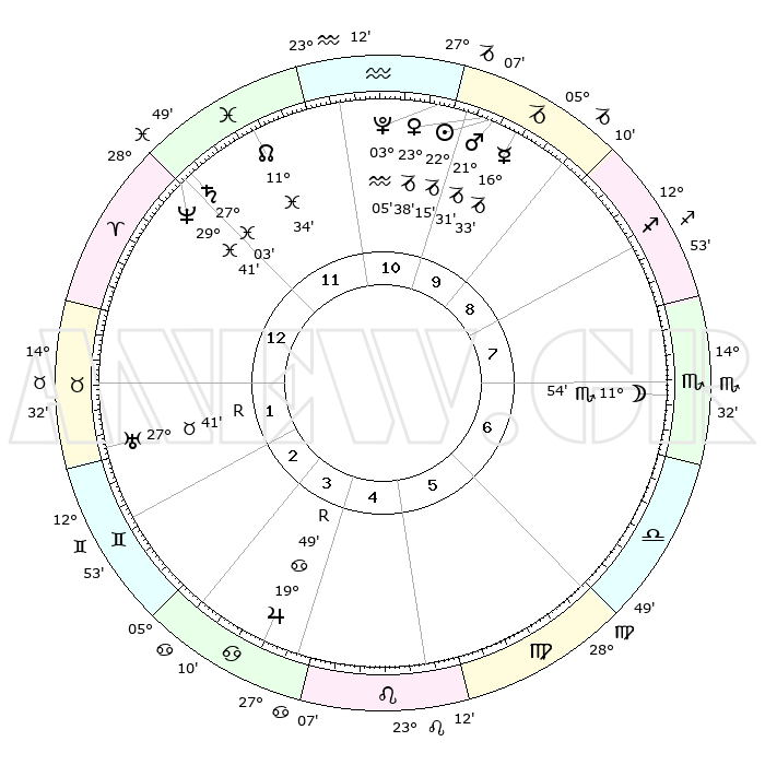 | | ΘΕΣΕΙΣ ΠΛΑΝΗΤΩΝ ΑΣΤΡΟΛΟΓΙΚΟΥ ΧΑΡΤΗ ΤΗΣ ΣΤΙΓΜΗΣ ΑΥΤΗΣ | | | | Πλανήτης | Ζώδιο | Μοίρες | Δεκαήμ. | Σε οίκο | Απόκλιση | | Ακμές των οίκων | | Ηλιος | Αιγόκερως | 22°10' | Τρίτο | 10 | 21 S 37 | | 1ος | 02°11' | Κριός | | Σελήνη | Σκορπιός | 10°59' | Δεύτερο | 7 | 19 S 22 | | 2ος | 11°56' | Ταύρος | | Ερμής | Αιγόκερως | 16°25' | Δεύτερο | 10 | 24 S 02 | | 3ος | 09°01' | Δίδυμοι | | Αφροδίτη | Αιγόκερως | 23°32' | Τρίτο | 10 | 22 S 16 | | 4ος | 01°13' | Καρκίνος | | Αρης | Αιγόκερως | 21°27' | Τρίτο | 10 | 22 S 40 | | 5ος | 23°38' | Καρκίνος | | Δίας | Καρκίνος | 19°50'R | Δεύτερο | 4 | 22 N 14 | | 6ος | 21°22' | Λέων | | Κρόνος | Ιχθείς | 27°03' | Τρίτο | 12 | 03 S 13 | | 7ος | 02°11' | Ζυγός | | Ουρανός | Ταύρος | 27°41'R | Τρίτο | 2 | 19 N 27 | | 8ος | 11°56' | Σκορπιός | | Ποσειδώνας | Ιχθείς | 29°41' | Τρίτο | 12 | 01 S 20 | | 9ος | 09°01' | Τοξότης | | Πλούτωνας | Υδροχόος | 03°04' | Πρώτο | 11 | 23 S 09 | | 10ος | 01°14' | Αιγόκερως | | Β. Δεσμός | Ιχθείς | 11°34' | Δεύτερο | 12 | 07 S 13 | | 11ος | 23°38' | Αιγόκερως | | Ωροσκόπος | Κριός | 02°11' | Πρώτο | | | 12ος | 21°22' | Υδροχόος | | Μεσουράνημα | Αιγόκερως | 01°14' | Πρώτο | | | |