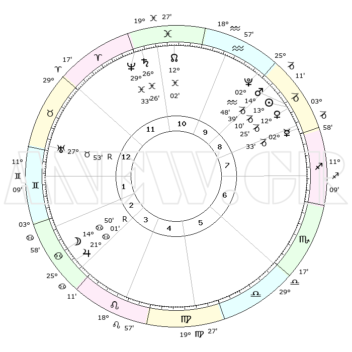 | | ΘΕΣΕΙΣ ΠΛΑΝΗΤΩΝ ΑΣΤΡΟΛΟΓΙΚΟΥ ΧΑΡΤΗ ΤΗΣ ΣΤΙΓΜΗΣ ΑΥΤΗΣ | | | | Πλανήτης | Ζώδιο | Μοίρες | Δεκαήμ. | Σε οίκο | Απόκλιση | | Ακμές των οίκων | | Ηλιος | Αιγόκερως | 12°54' | Δεύτερο | 12 | 22 S 48 | | 1ος | 27°60' | Αιγόκερως | | Σελήνη | Καρκίνος | 10°57' | Δεύτερο | 6 | 27 N 21 | | 2ος | 11°45' | Ιχθείς | | Ερμής | Αιγόκερως | 02°09' | Πρώτο | 11 | 24 S 14 | | 3ος | 20°30' | Κριός | | Αφροδίτη | Αιγόκερως | 12°05' | Δεύτερο | 12 | 23 S 28 | | 4ος | 19°19' | Ταύρος | | Αρης | Αιγόκερως | 14°27' | Δεύτερο | 12 | 23 S 33 | | 5ος | 12°14' | Δίδυμοι | | Δίας | Καρκίνος | 21°03'R | Τρίτο | 6 | 22 N 02 | | 6ος | 03°35' | Καρκίνος | | Κρόνος | Ιχθείς | 26°25' | Τρίτο | 2 | 03 S 29 | | 7ος | 27°60' | Καρκίνος | | Ουρανός | Ταύρος | 27°53'R | Τρίτο | 4 | 19 N 29 | | 8ος | 11°45' | Παρθένος | | Ποσειδώνας | Ιχθείς | 29°32' | Τρίτο | 2 | 01 S 24 | | 9ος | 20°30' | Ζυγός | | Πλούτωνας | Υδροχόος | 02°48' | Πρώτο | 1 | 23 S 12 | | 10ος | 19°19' | Σκορπιός | | Β. Δεσμός | Ιχθείς | 12°03' | Δεύτερο | 2 | 07 S 02 | | 11ος | 12°14' | Τοξότης | | Ωροσκόπος | Αιγόκερως | 27°60' | Τρίτο | | | 12ος | 03°35' | Αιγόκερως | | Μεσουράνημα | Σκορπιός | 19°19' | Δεύτερο | | | |