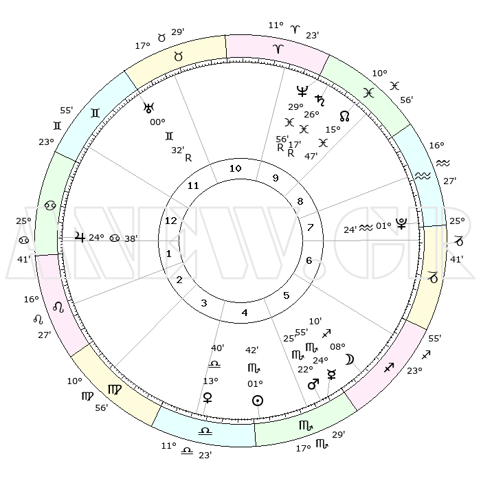 | | ΘΕΣΕΙΣ ΠΛΑΝΗΤΩΝ ΑΣΤΡΟΛΟΓΙΚΟΥ ΧΑΡΤΗ ΤΗΣ ΣΤΙΓΜΗΣ ΑΥΤΗΣ | | | | Πλανήτης | Ζώδιο | Μοίρες | Δεκαήμ. | Σε οίκο | Απόκλιση | | Ακμές των οίκων | | Ηλιος | Σκορπιός | 01°12' | Πρώτο | 10 | 11 S 53 | | 1ος | 20°25' | Τοξότης | | Σελήνη | Τοξότης | 02°12' | Πρώτο | 12 | 25 S 27 | | 2ος | 25°16' | Αιγόκερως | | Ερμής | Σκορπιός | 24°19' | Τρίτο | 11 | 21 S 21 | | 3ος | 04°16' | Ιχθείς | | Αφροδίτη | Ζυγός | 13°03' | Δεύτερο | 10 | 03 S 44 | | 4ος | 09°30' | Κριός | | Αρης | Σκορπιός | 22°04' | Τρίτο | 11 | 18 S 35 | | 5ος | 07°24' | Ταύρος | | Δίας | Καρκίνος | 24°36' | Τρίτο | 7 | 21 N 16 | | 6ος | 29°59' | Ταύρος | | Κρόνος | Ιχθείς | 26°19'R | Τρίτο | 3 | 03 S 45 | | 7ος | 20°25' | Δίδυμοι | | Ουρανός | Δίδυμοι | 00°33'R | Πρώτο | 6 | 20 N 03 | | 8ος | 25°16' | Καρκίνος | | Ποσειδώνας | Ιχθείς | 29°57'R | Τρίτο | 3 | 01 S 17 | | 9ος | 04°16' | Παρθένος | | Πλούτωνας | Υδροχόος | 01°24' | Πρώτο | 2 | 23 S 32 | | 10ος | 09°30' | Ζυγός | | Β. Δεσμός | Ιχθείς | 15°48' | Δεύτερο | 3 | 05 S 36 | | 11ος | 07°24' | Σκορπιός | | Ωροσκόπος | Τοξότης | 20°25' | Τρίτο | | | 12ος | 29°58' | Σκορπιός | | Μεσουράνημα | Ζυγός | 09°30' | Πρώτο | | | |