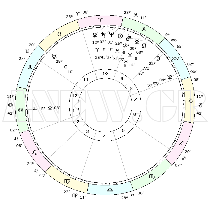 | | ΘΕΣΕΙΣ ΠΛΑΝΗΤΩΝ ΑΣΤΡΟΛΟΓΙΚΟΥ ΧΑΡΤΗ ΤΗΣ ΣΤΙΓΜΗΣ ΑΥΤΗΣ | | | | Πλανήτης | Ζώδιο | Μοίρες | Δεκαήμ. | Σε οίκο | Απόκλιση | | Ακμές των οίκων | | Ηλιος | Ιχθείς | 25°46' | Τρίτο | 10 | 01 S 41 | | 1ος | 17°10' | Δίδυμοι | | Σελήνη | Υδροχόος | 21°59' | Τρίτο | 9 | 15 S 38 | | 2ος | 09°09' | Καρκίνος | | Ερμής | Ιχθείς | 09°31'R | Πρώτο | 10 | 06 S 04 | | 3ος | 00°24' | Λέων | | Αφροδίτη | Κριός | 12°19' | Δεύτερο | 11 | 03 N 57 | | 4ος | 24°53' | Λέων | | Αρης | Ιχθείς | 10°51' | Δεύτερο | 10 | 08 S 30 | | 5ος | 26°31' | Παρθένος | | Δίας | Καρκίνος | 15°08' | Δεύτερο | 2 | 22 N 56 | | 6ος | 06°44' | Σκορπιός | | Κρόνος | Κριός | 03°43' | Πρώτο | 11 | 00 S 29 | | 7ος | 17°10' | Τοξότης | | Ουρανός | Ταύρος | 28°09' | Τρίτο | 12 | 19 N 34 | | 8ος | 09°09' | Αιγόκερως | | Ποσειδώνας | Κριός | 01°37' | Πρώτο | 11 | 00 S 33 | | 9ος | 00°24' | Υδροχόος | | Πλούτωνας | Υδροχόος | 04°55' | Πρώτο | 9 | 22 S 49 | | 10ος | 24°53' | Υδροχόος | | Β. Δεσμός | Ιχθείς | 08°14' | Πρώτο | 10 | 08 S 29 | | 11ος | 26°31' | Ιχθείς | | Ωροσκόπος | Δίδυμοι | 17°10' | Δεύτερο | | | 12ος | 06°44' | Ταύρος | | Μεσουράνημα | Υδροχόος | 24°53' | Τρίτο | | | |