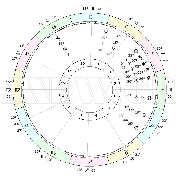 | | ΘΕΣΕΙΣ ΠΛΑΝΗΤΩΝ ΑΣΤΡΟΛΟΓΙΚΟΥ ΧΑΡΤΗ ΤΗΣ ΣΤΙΓΜΗΣ ΑΥΤΗΣ | | | | Πλανήτης | Ζώδιο | Μοίρες | Δεκαήμ. | Σε οίκο | Απόκλιση | | Ακμές των οίκων | | Ηλιος | Κριός | 22°37' | Τρίτο | 9 | 08 N 48 | | 1ος | 27°14' | Λέων | | Σελήνη | Υδροχόος | 18°55' | Δεύτερο | 6 | 16 S 46 | | 2ος | 20°48' | Παρθένος | | Ερμής | Ιχθείς | 26°26' | Τρίτο | 8 | 03 S 42 | | 3ος | 19°13' | Ζυγός | | Αφροδίτη | Ταύρος | 15°47' | Δεύτερο | 9 | 16 N 37 | | 4ος | 22°06' | Σκορπιός | | Αρης | Κριός | 02°07' | Πρώτο | 8 | 00 S 05 | | 5ος | 26°29' | Τοξότης | | Δίας | Καρκίνος | 16°43' | Δεύτερο | 11 | 22 N 46 | | 6ος | 28°40' | Αιγόκερως | | Κρόνος | Κριός | 07°05' | Πρώτο | 8 | 00 N 51 | | 7ος | 27°14' | Υδροχόος | | Ουρανός | Ταύρος | 29°18' | Τρίτο | 10 | 19 N 50 | | 8ος | 20°48' | Ιχθείς | | Ποσειδώνας | Κριός | 02°38' | Πρώτο | 8 | 00 S 09 | | 9ος | 19°13' | Κριός | | Πλούτωνας | Υδροχόος | 05°22' | Πρώτο | 6 | 22 S 47 | | 10ος | 22°06' | Ταύρος | | Β. Δεσμός | Ιχθείς | 06°48' | Πρώτο | 7 | 09 S 01 | | 11ος | 26°29' | Δίδυμοι | | Ωροσκόπος | Λέων | 27°14' | Τρίτο | | | 12ος | 28°40' | Καρκίνος | | Μεσουράνημα | Ταύρος | 22°06' | Τρίτο | | | |