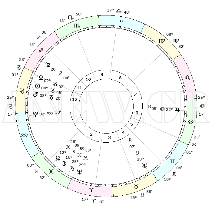 | | ΘΕΣΕΙΣ ΠΛΑΝΗΤΩΝ ΑΣΤΡΟΛΟΓΙΚΟΥ ΧΑΡΤΗ ΤΗΣ ΣΤΙΓΜΗΣ ΑΥΤΗΣ | | | | Πλανήτης | Ζώδιο | Μοίρες | Δεκαήμ. | Σε οίκο | Απόκλιση | | Ακμές των οίκων | | Ηλιος | Αιγόκερως | 04°41' | Πρώτο | 1 | 23 S 21 | | 1ος | 28°34' | Τοξότης | | Σελήνη | Ιχθείς | 15°11' | Δεύτερο | 2 | 05 S 31 | | 2ος | 05°22' | Υδροχόος | | Ερμής | Τοξότης | 19°57' | Δεύτερο | 12 | 22 S 57 | | 3ος | 15°16' | Ιχθείς | | Αφροδίτη | Αιγόκερως | 01°57' | Πρώτο | 1 | 23 S 42 | | 4ος | 19°25' | Κριός | | Αρης | Αιγόκερως | 08°17' | Πρώτο | 1 | 24 S 02 | | 5ος | 15°58' | Ταύρος | | Δίας | Καρκίνος | 22°05'R | Τρίτο | 7 | 21 N 51 | | 6ος | 07°52' | Δίδυμοι | | Κρόνος | Ιχθείς | 25°59' | Τρίτο | 3 | 03 S 41 | | 7ος | 28°34' | Δίδυμοι | | Ουρανός | Ταύρος | 28°07'R | Τρίτο | 5 | 19 N 32 | | 8ος | 05°22' | Λέων | | Ποσειδώνας | Ιχθείς | 29°27' | Τρίτο | 3 | 01 S 27 | | 9ος | 15°16' | Παρθένος | | Πλούτωνας | Υδροχόος | 02°33' | Πρώτο | 1 | 23 S 15 | | 10ος | 19°25' | Ζυγός | | Β. Δεσμός | Ιχθείς | 12°29' | Δεύτερο | 2 | 06 S 53 | | 11ος | 15°58' | Σκορπιός | | Ωροσκόπος | Τοξότης | 28°34' | Τρίτο | | | 12ος | 07°52' | Τοξότης | | Μεσουράνημα | Ζυγός | 19°25' | Δεύτερο | | | |