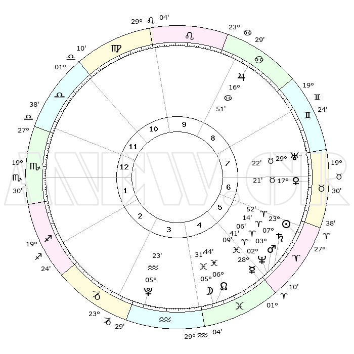 | | ΘΕΣΕΙΣ ΠΛΑΝΗΤΩΝ ΑΣΤΡΟΛΟΓΙΚΟΥ ΧΑΡΤΗ ΤΗΣ ΣΤΙΓΜΗΣ ΑΥΤΗΣ | | | | Πλανήτης | Ζώδιο | Μοίρες | Δεκαήμ. | Σε οίκο | Απόκλιση | | Ακμές των οίκων | | Ηλιος | Κριός | 23°48' | Τρίτο | 6 | 09 N 14 | | 1ος | 01°24' | Σκορπιός | | Σελήνη | Ιχθείς | 04°42' | Πρώτο | 4 | 10 S 05 | | 2ος | 29°54' | Σκορπιός | | Ερμής | Ιχθείς | 28°03' | Τρίτο | 5 | 03 S 07 | | 3ος | 01°58' | Αιγόκερως | | Αφροδίτη | Ταύρος | 17°17' | Δεύτερο | 7 | 17 N 06 | | 4ος | 06°15' | Υδροχόος | | Αρης | Κριός | 03°03' | Πρώτο | 5 | 00 N 18 | | 5ος | 09°09' | Ιχθείς | | Δίας | Καρκίνος | 16°50' | Δεύτερο | 9 | 22 N 45 | | 6ος | 07°41' | Κριός | | Κρόνος | Κριός | 07°14' | Πρώτο | 5 | 00 N 54 | | 7ος | 01°24' | Ταύρος | | Ουρανός | Ταύρος | 29°22' | Τρίτο | 7 | 19 N 51 | | 8ος | 29°54' | Ταύρος | | Ποσειδώνας | Κριός | 02°41' | Πρώτο | 5 | 00 S 08 | | 9ος | 01°58' | Καρκίνος | | Πλούτωνας | Υδροχόος | 05°23' | Πρώτο | 3 | 22 S 47 | | 10ος | 06°15' | Λέων | | Β. Δεσμός | Ιχθείς | 06°44' | Πρώτο | 4 | 09 S 02 | | 11ος | 09°09' | Παρθένος | | Ωροσκόπος | Σκορπιός | 01°24' | Πρώτο | | | 12ος | 07°41' | Ζυγός | | Μεσουράνημα | Λέων | 06°15' | Πρώτο | | | |