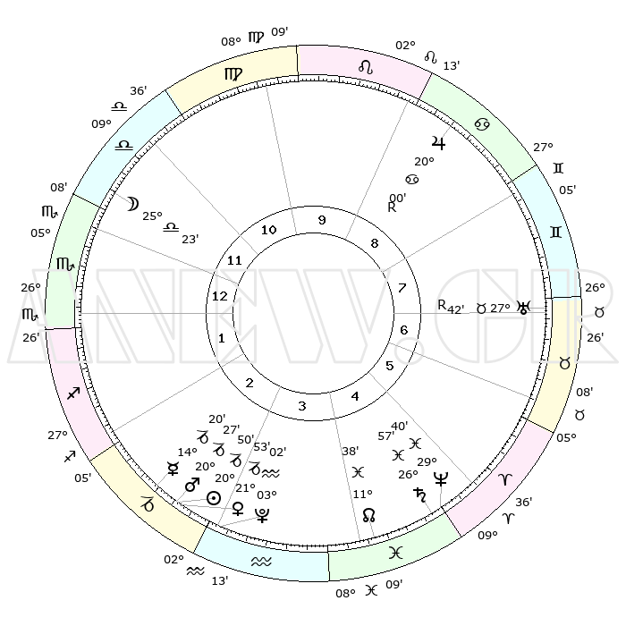 | | ΘΕΣΕΙΣ ΠΛΑΝΗΤΩΝ ΑΣΤΡΟΛΟΓΙΚΟΥ ΧΑΡΤΗ ΤΗΣ ΣΤΙΓΜΗΣ ΑΥΤΗΣ | | | | Πλανήτης | Ζώδιο | Μοίρες | Δεκαήμ. | Σε οίκο | Απόκλιση | | Ακμές των οίκων | | Ηλιος | Αιγόκερως | 20°15' | Τρίτο | 9 | 21 S 54 | | 1ος | 02°07' | Δίδυμοι | | Σελήνη | Ζυγός | 18°28' | Δεύτερο | 6 | 10 S 10 | | 2ος | 26°30' | Δίδυμοι | | Ερμής | Αιγόκερως | 13°26' | Δεύτερο | 8 | 24 S 13 | | 3ος | 17°51' | Καρκίνος | | Αφροδίτη | Αιγόκερως | 21°10' | Τρίτο | 9 | 22 S 36 | | 4ος | 10°47' | Λέων | | Αρης | Αιγόκερως | 20°00' | Τρίτο | 9 | 22 S 53 | | 5ος | 09°37' | Παρθένος | | Δίας | Καρκίνος | 20°05'R | Τρίτο | 3 | 22 N 11 | | 6ος | 18°23' | Ζυγός | | Κρόνος | Ιχθείς | 26°54' | Τρίτο | 11 | 03 S 17 | | 7ος | 02°07' | Τοξότης | | Ουρανός | Ταύρος | 27°43'R | Τρίτο | 12 | 19 N 27 | | 8ος | 26°30' | Τοξότης | | Ποσειδώνας | Ιχθείς | 29°39' | Τρίτο | 11 | 01 S 21 | | 9ος | 17°51' | Αιγόκερως | | Πλούτωνας | Υδροχόος | 03°01' | Πρώτο | 9 | 23 S 09 | | 10ος | 10°47' | Υδροχόος | | Β. Δεσμός | Ιχθείς | 11°40' | Δεύτερο | 11 | 07 S 11 | | 11ος | 09°37' | Ιχθείς | | Ωροσκόπος | Δίδυμοι | 02°07' | Πρώτο | | | 12ος | 18°23' | Κριός | | Μεσουράνημα | Υδροχόος | 10°47' | Δεύτερο | | | |