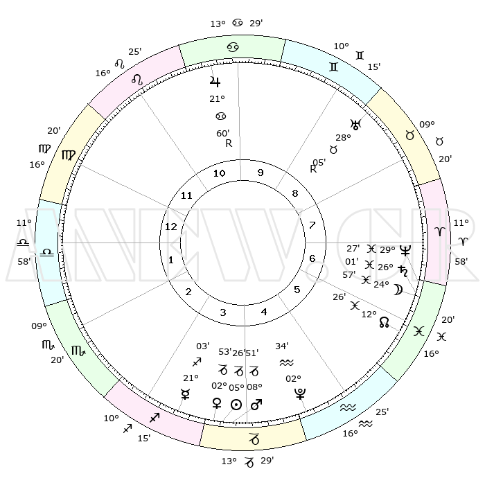 | | ΘΕΣΕΙΣ ΠΛΑΝΗΤΩΝ ΑΣΤΡΟΛΟΓΙΚΟΥ ΧΑΡΤΗ ΤΗΣ ΣΤΙΓΜΗΣ ΑΥΤΗΣ | | | | Πλανήτης | Ζώδιο | Μοίρες | Δεκαήμ. | Σε οίκο | Απόκλιση | | Ακμές των οίκων | | Ηλιος | Αιγόκερως | 05°21' | Πρώτο | 4 | 23 S 19 | | 1ος | 18°38' | Παρθένος | | Σελήνη | Ιχθείς | 23°54' | Τρίτο | 7 | 01 S 24 | | 2ος | 14°18' | Ζυγός | | Ερμής | Τοξότης | 20°56' | Τρίτο | 4 | 23 S 06 | | 3ος | 14°15' | Σκορπιός | | Αφροδίτη | Αιγόκερως | 02°46' | Πρώτο | 4 | 23 S 43 | | 4ος | 17°11' | Τοξότης | | Αρης | Αιγόκερως | 08°47' | Πρώτο | 4 | 24 S 00 | | 5ος | 20°25' | Αιγόκερως | | Δίας | Καρκίνος | 22°00'R | Τρίτο | 11 | 21 N 52 | | 6ος | 21°17' | Υδροχόος | | Κρόνος | Ιχθείς | 26°01' | Τρίτο | 7 | 03 S 41 | | 7ος | 18°38' | Ιχθείς | | Ουρανός | Ταύρος | 28°06'R | Τρίτο | 9 | 19 N 32 | | 8ος | 14°18' | Κριός | | Ποσειδώνας | Ιχθείς | 29°27' | Τρίτο | 7 | 01 S 27 | | 9ος | 14°15' | Ταύρος | | Πλούτωνας | Υδροχόος | 02°34' | Πρώτο | 5 | 23 S 15 | | 10ος | 17°11' | Δίδυμοι | | Β. Δεσμός | Ιχθείς | 12°26' | Δεύτερο | 6 | 06 S 53 | | 11ος | 20°25' | Καρκίνος | | Ωροσκόπος | Παρθένος | 18°38' | Δεύτερο | | | 12ος | 21°17' | Λέων | | Μεσουράνημα | Δίδυμοι | 17°11' | Δεύτερο | | | |