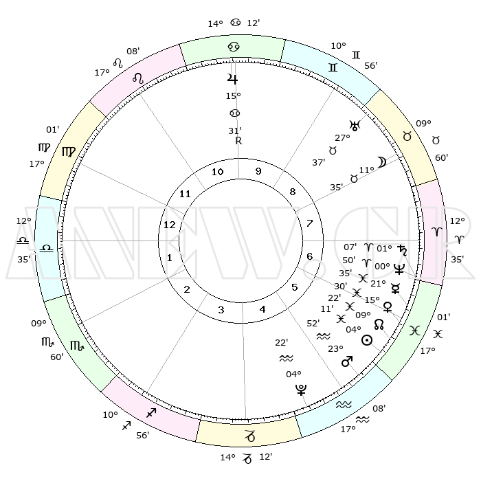 | | ΘΕΣΕΙΣ ΠΛΑΝΗΤΩΝ ΑΣΤΡΟΛΟΓΙΚΟΥ ΧΑΡΤΗ ΤΗΣ ΣΤΙΓΜΗΣ ΑΥΤΗΣ | | | | Πλανήτης | Ζώδιο | Μοίρες | Δεκαήμ. | Σε οίκο | Απόκλιση | | Ακμές των οίκων | | Ηλιος | Ιχθείς | 04°06' | Πρώτο | 6 | 10 S 00 | | 1ος | 19°03' | Παρθένος | | Σελήνη | Ταύρος | 10°27' | Δεύτερο | 8 | 19 N 22 | | 2ος | 14°46' | Ζυγός | | Ερμής | Ιχθείς | 21°32' | Τρίτο | 7 | 01 S 34 | | 3ος | 14°44' | Σκορπιός | | Αφροδίτη | Ιχθείς | 15°24' | Δεύτερο | 6 | 07 S 05 | | 4ος | 17°40' | Τοξότης | | Αρης | Υδροχόος | 23°48' | Τρίτο | 6 | 14 S 37 | | 5ος | 20°52' | Αιγόκερως | | Δίας | Καρκίνος | 15°31'R | Δεύτερο | 10 | 22 N 52 | | 6ος | 21°44' | Υδροχόος | | Κρόνος | Κριός | 01°06' | Πρώτο | 7 | 01 S 31 | | 7ος | 19°03' | Ιχθείς | | Ουρανός | Ταύρος | 27°37' | Τρίτο | 9 | 19 N 27 | | 8ος | 14°46' | Κριός | | Ποσειδώνας | Κριός | 00°50' | Πρώτο | 7 | 00 S 52 | | 9ος | 14°44' | Ταύρος | | Πλούτωνας | Υδροχόος | 04°22' | Πρώτο | 5 | 22 S 54 | | 10ος | 17°40' | Δίδυμοι | | Β. Δεσμός | Ιχθείς | 09°23' | Πρώτο | 6 | 08 S 03 | | 11ος | 20°52' | Καρκίνος | | Ωροσκόπος | Παρθένος | 19°03' | Δεύτερο | | | 12ος | 21°44' | Λέων | | Μεσουράνημα | Δίδυμοι | 17°40' | Δεύτερο | | | |