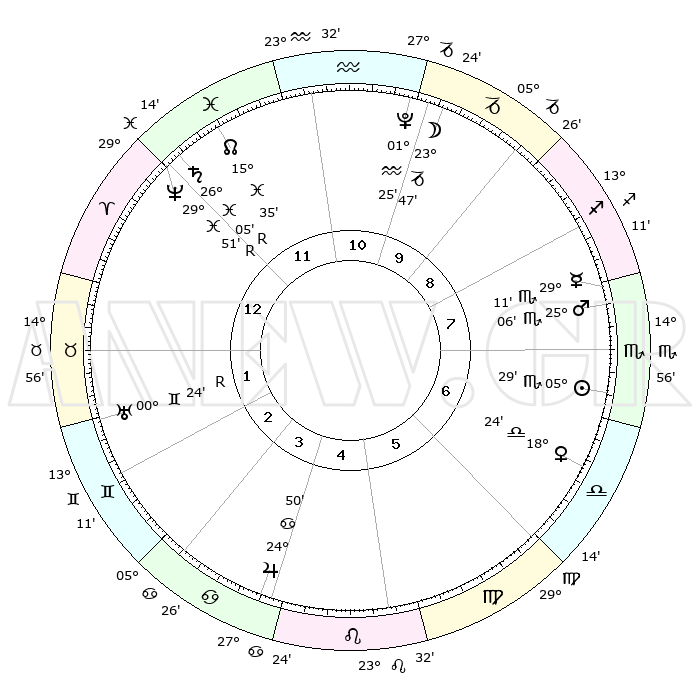 | | ΘΕΣΕΙΣ ΠΛΑΝΗΤΩΝ ΑΣΤΡΟΛΟΓΙΚΟΥ ΧΑΡΤΗ ΤΗΣ ΣΤΙΓΜΗΣ ΑΥΤΗΣ | | | | Πλανήτης | Ζώδιο | Μοίρες | Δεκαήμ. | Σε οίκο | Απόκλιση | | Ακμές των οίκων | | Ηλιος | Σκορπιός | 05°05' | Πρώτο | 12 | 13 S 13 | | 1ος | 22°49' | Σκορπιός | | Σελήνη | Αιγόκερως | 18°53' | Δεύτερο | 2 | 26 S 25 | | 2ος | 23°03' | Τοξότης | | Ερμής | Σκορπιός | 28°46' | Τρίτο | 1 | 22 S 37 | | 3ος | 27°37' | Αιγόκερως | | Αφροδίτη | Ζυγός | 17°55' | Δεύτερο | 11 | 05 S 38 | | 4ος | 03°23' | Ιχθείς | | Αρης | Σκορπιός | 24°49' | Τρίτο | 1 | 19 S 19 | | 5ος | 05°13' | Κριός | | Δίας | Καρκίνος | 24°49' | Τρίτο | 8 | 21 N 14 | | 6ος | 01°14' | Ταύρος | | Κρόνος | Ιχθείς | 26°06'R | Τρίτο | 4 | 03 S 49 | | 7ος | 22°49' | Ταύρος | | Ουρανός | Δίδυμοι | 00°25'R | Πρώτο | 7 | 20 N 02 | | 8ος | 23°03' | Δίδυμοι | | Ποσειδώνας | Ιχθείς | 29°52'R | Τρίτο | 4 | 01 S 19 | | 9ος | 27°37' | Καρκίνος | | Πλούτωνας | Υδροχόος | 01°25' | Πρώτο | 3 | 23 S 31 | | 10ος | 03°23' | Παρθένος | | Β. Δεσμός | Ιχθείς | 15°36' | Δεύτερο | 4 | 05 S 41 | | 11ος | 05°13' | Ζυγός | | Ωροσκόπος | Σκορπιός | 22°49' | Τρίτο | | | 12ος | 01°14' | Σκορπιός | | Μεσουράνημα | Παρθένος | 03°23' | Πρώτο | | | |