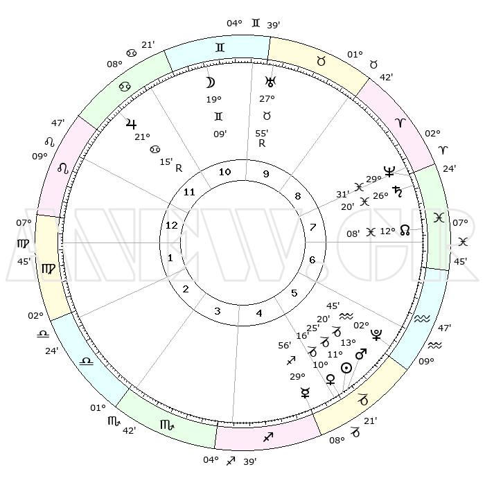 | | ΘΕΣΕΙΣ ΠΛΑΝΗΤΩΝ ΑΣΤΡΟΛΟΓΙΚΟΥ ΧΑΡΤΗ ΤΗΣ ΣΤΙΓΜΗΣ ΑΥΤΗΣ | | | | Πλανήτης | Ζώδιο | Μοίρες | Δεκαήμ. | Σε οίκο | Απόκλιση | | Ακμές των οίκων | | Ηλιος | Αιγόκερως | 11°20' | Δεύτερο | 5 | 22 S 57 | | 1ος | 16°57' | Λέων | | Σελήνη | Δίδυμοι | 18°05' | Δεύτερο | 11 | 27 N 54 | | 2ος | 09°27' | Παρθένος | | Ερμής | Τοξότης | 29°49' | Τρίτο | 5 | 24 S 05 | | 3ος | 06°44' | Ζυγός | | Αφροδίτη | Αιγόκερως | 10°10' | Δεύτερο | 5 | 23 S 35 | | 4ος | 09°16' | Σκορπιός | | Αρης | Αιγόκερως | 13°17' | Δεύτερο | 5 | 23 S 40 | | 5ος | 14°24' | Τοξότης | | Δίας | Καρκίνος | 21°15'R | Τρίτο | 12 | 22 N 00 | | 6ος | 17°38' | Αιγόκερως | | Κρόνος | Ιχθείς | 26°20' | Τρίτο | 8 | 03 S 32 | | 7ος | 16°57' | Υδροχόος | | Ουρανός | Ταύρος | 27°55'R | Τρίτο | 10 | 19 N 30 | | 8ος | 09°27' | Ιχθείς | | Ποσειδώνας | Ιχθείς | 29°31' | Τρίτο | 8 | 01 S 25 | | 9ος | 06°44' | Κριός | | Πλούτωνας | Υδροχόος | 02°45' | Πρώτο | 6 | 23 S 13 | | 10ος | 09°16' | Ταύρος | | Β. Δεσμός | Ιχθείς | 12°08' | Δεύτερο | 8 | 07 S 01 | | 11ος | 14°24' | Δίδυμοι | | Ωροσκόπος | Λέων | 16°57' | Δεύτερο | | | 12ος | 17°38' | Καρκίνος | | Μεσουράνημα | Ταύρος | 09°16' | Πρώτο | | | |