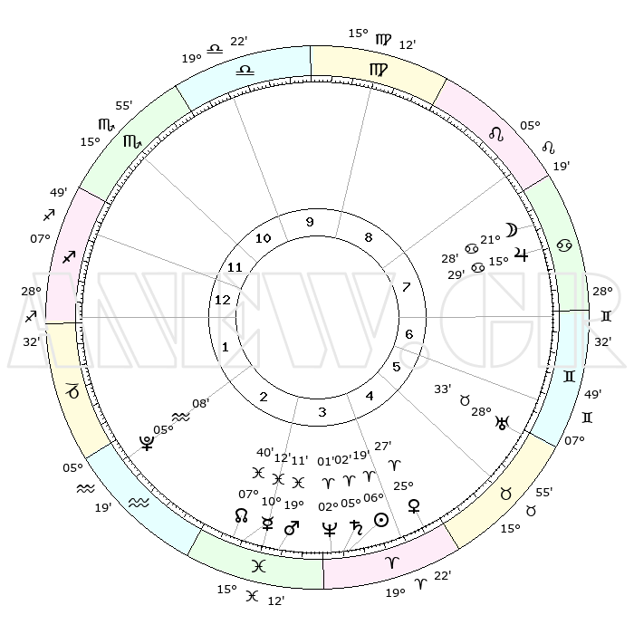 | | ΘΕΣΕΙΣ ΠΛΑΝΗΤΩΝ ΑΣΤΡΟΛΟΓΙΚΟΥ ΧΑΡΤΗ ΤΗΣ ΣΤΙΓΜΗΣ ΑΥΤΗΣ | | | | Πλανήτης | Ζώδιο | Μοίρες | Δεκαήμ. | Σε οίκο | Απόκλιση | | Ακμές των οίκων | | Ηλιος | Κριός | 06°15' | Πρώτο | 4 | 02 N 29 | | 1ος | 08°02' | Τοξότης | | Σελήνη | Καρκίνος | 20°33' | Τρίτο | 8 | 25 N 43 | | 2ος | 10°25' | Αιγόκερως | | Ερμής | Ιχθείς | 10°10' | Δεύτερο | 3 | 08 S 07 | | 3ος | 17°29' | Υδροχόος | | Αφροδίτη | Κριός | 25°22' | Τρίτο | 5 | 09 N 13 | | 4ος | 23°32' | Ιχθείς | | Αρης | Ιχθείς | 19°08' | Δεύτερο | 3 | 05 S 16 | | 5ος | 23°27' | Κριός | | Δίας | Καρκίνος | 15°29' | Δεύτερο | 8 | 22 N 54 | | 6ος | 17°26' | Ταύρος | | Κρόνος | Κριός | 05°02' | Πρώτο | 4 | 00 N 03 | | 7ος | 08°02' | Δίδυμοι | | Ουρανός | Ταύρος | 28°33' | Τρίτο | 6 | 19 N 40 | | 8ος | 10°25' | Καρκίνος | | Ποσειδώνας | Κριός | 02°01' | Πρώτο | 4 | 00 S 24 | | 9ος | 17°29' | Λέων | | Πλούτωνας | Υδροχόος | 05°08' | Πρώτο | 2 | 22 S 48 | | 10ος | 23°32' | Παρθένος | | Β. Δεσμός | Ιχθείς | 07°40' | Πρώτο | 3 | 08 S 41 | | 11ος | 23°27' | Ζυγός | | Ωροσκόπος | Τοξότης | 08°02' | Πρώτο | | | 12ος | 17°26' | Σκορπιός | | Μεσουράνημα | Παρθένος | 23°32' | Τρίτο | | | |