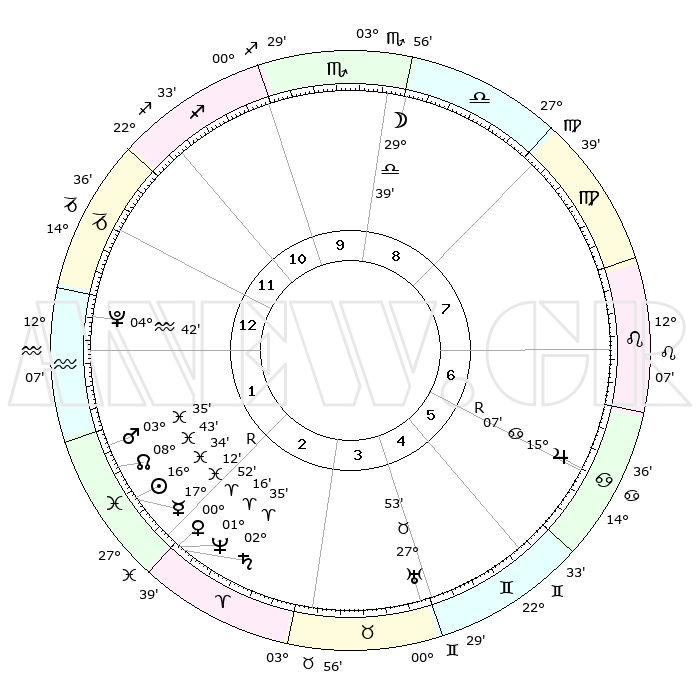 | | ΘΕΣΕΙΣ ΠΛΑΝΗΤΩΝ ΑΣΤΡΟΛΟΓΙΚΟΥ ΧΑΡΤΗ ΤΗΣ ΣΤΙΓΜΗΣ ΑΥΤΗΣ | | | | Πλανήτης | Ζώδιο | Μοίρες | Δεκαήμ. | Σε οίκο | Απόκλιση | | Ακμές των οίκων | | Ηλιος | Ιχθείς | 16°25' | Δεύτερο | 3 | 05 S 21 | | 1ος | 18°52' | Τοξότης | | Σελήνη | Ζυγός | 27°54' | Τρίτο | 10 | 14 S 26 | | 2ος | 23°23' | Αιγόκερως | | Ερμής | Ιχθείς | 17°21'R | Δεύτερο | 3 | 01 S 37 | | 3ος | 02°10' | Ιχθείς | | Αφροδίτη | Κριός | 00°42' | Πρώτο | 3 | 00 S 52 | | 4ος | 07°33' | Κριός | | Αρης | Ιχθείς | 03°29' | Πρώτο | 3 | 11 S 15 | | 5ος | 05°43' | Ταύρος | | Δίας | Καρκίνος | 15°07'R | Δεύτερο | 7 | 22 N 56 | | 6ος | 28°27' | Ταύρος | | Κρόνος | Κριός | 02°34' | Πρώτο | 3 | 00 S 56 | | 7ος | 18°52' | Δίδυμοι | | Ουρανός | Ταύρος | 27°53' | Τρίτο | 5 | 19 N 30 | | 8ος | 23°23' | Καρκίνος | | Ποσειδώνας | Κριός | 01°16' | Πρώτο | 3 | 00 S 42 | | 9ος | 02°10' | Παρθένος | | Πλούτωνας | Υδροχόος | 04°42' | Πρώτο | 2 | 22 S 51 | | 10ος | 07°33' | Ζυγός | | Β. Δεσμός | Ιχθείς | 08°44' | Πρώτο | 3 | 08 S 18 | | 11ος | 05°43' | Σκορπιός | | Ωροσκόπος | Τοξότης | 18°52' | Δεύτερο | | | 12ος | 28°27' | Σκορπιός | | Μεσουράνημα | Ζυγός | 07°33' | Πρώτο | | | |