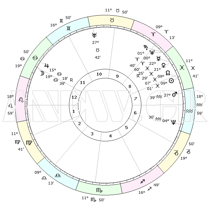 | | ΘΕΣΕΙΣ ΠΛΑΝΗΤΩΝ ΑΣΤΡΟΛΟΓΙΚΟΥ ΧΑΡΤΗ ΤΗΣ ΣΤΙΓΜΗΣ ΑΥΤΗΣ | | | | Πλανήτης | Ζώδιο | Μοίρες | Δεκαήμ. | Σε οίκο | Απόκλιση | | Ακμές των οίκων | | Ηλιος | Ιχθείς | 08°57' | Πρώτο | 8 | 08 S 13 | | 1ος | 29°02' | Καρκίνος | | Σελήνη | Καρκίνος | 18°40' | Δεύτερο | 12 | 26 N 10 | | 2ος | 20°00' | Λέων | | Ερμής | Ιχθείς | 22°26'R | Τρίτο | 9 | 00 S 12 | | 3ος | 14°55' | Παρθένος | | Αφροδίτη | Ιχθείς | 21°24' | Τρίτο | 9 | 04 S 41 | | 4ος | 15°50' | Ζυγός | | Αρης | Υδροχόος | 27°36' | Τρίτο | 8 | 13 S 20 | | 5ος | 21°54' | Σκορπιός | | Δίας | Καρκίνος | 15°18'R | Δεύτερο | 12 | 22 N 54 | | 6ος | 27°46' | Τοξότης | | Κρόνος | Κριός | 01°40' | Πρώτο | 9 | 01 S 18 | | 7ος | 29°02' | Αιγόκερως | | Ουρανός | Ταύρος | 27°42' | Τρίτο | 11 | 19 N 28 | | 8ος | 20°00' | Υδροχόος | | Ποσειδώνας | Κριός | 00°60' | Πρώτο | 9 | 00 S 48 | | 9ος | 14°55' | Ιχθείς | | Πλούτωνας | Υδροχόος | 04°30' | Πρώτο | 7 | 22 S 53 | | 10ος | 15°50' | Κριός | | Β. Δεσμός | Ιχθείς | 09°07' | Πρώτο | 8 | 08 S 09 | | 11ος | 21°54' | Ταύρος | | Ωροσκόπος | Καρκίνος | 29°02' | Τρίτο | | | 12ος | 27°46' | Δίδυμοι | | Μεσουράνημα | Κριός | 15°50' | Δεύτερο | | | |