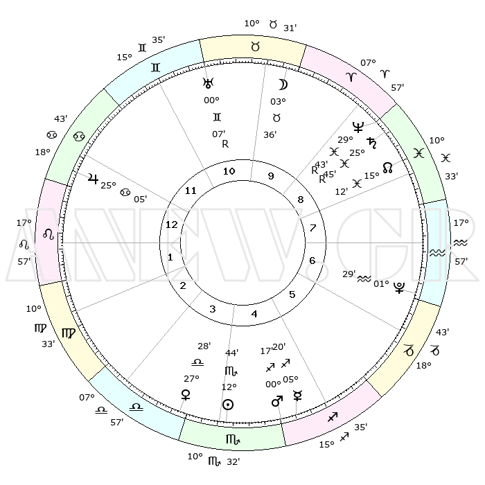 | | ΘΕΣΕΙΣ ΠΛΑΝΗΤΩΝ ΑΣΤΡΟΛΟΓΙΚΟΥ ΧΑΡΤΗ ΤΗΣ ΣΤΙΓΜΗΣ ΑΥΤΗΣ | | | | Πλανήτης | Ζώδιο | Μοίρες | Δεκαήμ. | Σε οίκο | Απόκλιση | | Ακμές των οίκων | | Ηλιος | Σκορπιός | 12°38' | Δεύτερο | 5 | 15 S 37 | | 1ος | 14°04' | Καρκίνος | | Σελήνη | Ταύρος | 01°51' | Πρώτο | 11 | 15 N 29 | | 2ος | 04°29' | Λέων | | Ερμής | Τοξότης | 05°16' | Πρώτο | 5 | 23 S 57 | | 3ος | 27°32' | Λέων | | Αφροδίτη | Ζυγός | 27°20' | Τρίτο | 4 | 09 S 12 | | 4ος | 26°11' | Παρθένος | | Αρης | Τοξότης | 00°12' | Πρώτο | 5 | 20 S 36 | | 5ος | 01°50' | Σκορπιός | | Δίας | Καρκίνος | 25°04' | Τρίτο | 1 | 21 N 12 | | 6ος | 10°11' | Τοξότης | | Κρόνος | Ιχθείς | 25°46'R | Τρίτο | 9 | 03 S 56 | | 7ος | 14°04' | Αιγόκερως | | Ουρανός | Δίδυμοι | 00°08'R | Πρώτο | 11 | 19 N 58 | | 8ος | 04°29' | Υδροχόος | | Ποσειδώνας | Ιχθείς | 29°43'R | Τρίτο | 10 | 01 S 22 | | 9ος | 27°32' | Υδροχόος | | Πλούτωνας | Υδροχόος | 01°29' | Πρώτο | 7 | 23 S 30 | | 10ος | 26°11' | Ιχθείς | | Β. Δεσμός | Ιχθείς | 15°12' | Δεύτερο | 9 | 05 S 50 | | 11ος | 01°50' | Ταύρος | | Ωροσκόπος | Καρκίνος | 14°04' | Δεύτερο | | | 12ος | 10°11' | Δίδυμοι | | Μεσουράνημα | Ιχθείς | 26°11' | Τρίτο | | | |