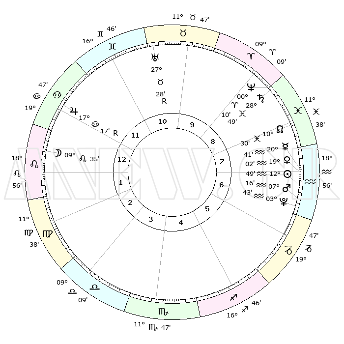 | | ΘΕΣΕΙΣ ΠΛΑΝΗΤΩΝ ΑΣΤΡΟΛΟΓΙΚΟΥ ΧΑΡΤΗ ΤΗΣ ΣΤΙΓΜΗΣ ΑΥΤΗΣ | | | | Πλανήτης | Ζώδιο | Μοίρες | Δεκαήμ. | Σε οίκο | Απόκλιση | | Ακμές των οίκων | | Ηλιος | Υδροχόος | 12°46' | Δεύτερο | 7 | 16 S 58 | | 1ος | 05°52' | Λέων | | Σελήνη | Λέων | 08°57' | Πρώτο | 1 | 20 N 33 | | 2ος | 27°20' | Λέων | | Ερμής | Υδροχόος | 20°36' | Τρίτο | 7 | 16 S 22 | | 3ος | 23°11' | Παρθένος | | Αφροδίτη | Υδροχόος | 18°59' | Δεύτερο | 7 | 16 S 26 | | 4ος | 24°53' | Ζυγός | | Αρης | Υδροχόος | 07°14' | Πρώτο | 7 | 19 S 28 | | 5ος | 00°43' | Τοξότης | | Δίας | Καρκίνος | 17°17'R | Δεύτερο | 12 | 22 N 37 | | 6ος | 05°29' | Αιγόκερως | | Κρόνος | Ιχθείς | 28°49' | Τρίτο | 9 | 02 S 28 | | 7ος | 05°52' | Υδροχόος | | Ουρανός | Ταύρος | 27°28'R | Τρίτο | 10 | 19 N 24 | | 8ος | 27°20' | Υδροχόος | | Ποσειδώνας | Κριός | 00°10' | Πρώτο | 9 | 01 S 09 | | 9ος | 23°11' | Ιχθείς | | Πλούτωνας | Υδροχόος | 03°43' | Πρώτο | 6 | 23 S 01 | | 10ος | 24°53' | Κριός | | Β. Δεσμός | Ιχθείς | 10°30' | Δεύτερο | 8 | 07 S 38 | | 11ος | 00°43' | Δίδυμοι | | Ωροσκόπος | Λέων | 05°52' | Πρώτο | | | 12ος | 05°29' | Καρκίνος | | Μεσουράνημα | Κριός | 24°53' | Τρίτο | | | |