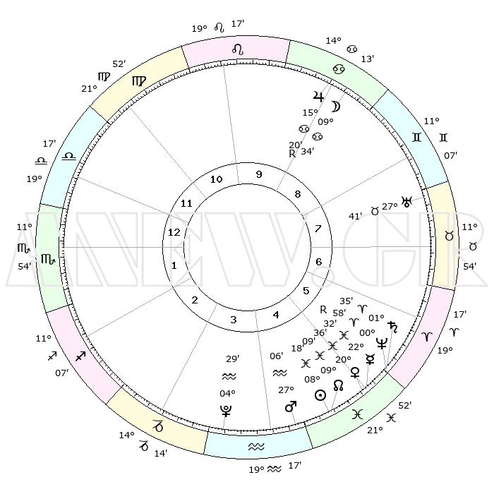 | | ΘΕΣΕΙΣ ΠΛΑΝΗΤΩΝ ΑΣΤΡΟΛΟΓΙΚΟΥ ΧΑΡΤΗ ΤΗΣ ΣΤΙΓΜΗΣ ΑΥΤΗΣ | | | | Πλανήτης | Ζώδιο | Μοίρες | Δεκαήμ. | Σε οίκο | Απόκλιση | | Ακμές των οίκων | | Ηλιος | Ιχθείς | 08°14' | Πρώτο | 5 | 08 S 29 | | 1ος | 22°55' | Ζυγός | | Σελήνη | Καρκίνος | 08°39' | Πρώτο | 9 | 27 N 44 | | 2ος | 20°55' | Σκορπιός | | Ερμής | Ιχθείς | 22°32'R | Τρίτο | 5 | 00 S 17 | | 3ος | 22°23' | Τοξότης | | Αφροδίτη | Ιχθείς | 20°31' | Τρίτο | 5 | 05 S 02 | | 4ος | 26°08' | Αιγόκερως | | Αρης | Υδροχόος | 27°02' | Τρίτο | 4 | 13 S 31 | | 5ος | 29°05' | Υδροχόος | | Δίας | Καρκίνος | 15°20'R | Δεύτερο | 9 | 22 N 53 | | 6ος | 28°20' | Ιχθείς | | Κρόνος | Κριός | 01°35' | Πρώτο | 6 | 01 S 20 | | 7ος | 22°55' | Κριός | | Ουρανός | Ταύρος | 27°41' | Τρίτο | 8 | 19 N 28 | | 8ος | 20°55' | Ταύρος | | Ποσειδώνας | Κριός | 00°58' | Πρώτο | 6 | 00 S 49 | | 9ος | 22°23' | Δίδυμοι | | Πλούτωνας | Υδροχόος | 04°29' | Πρώτο | 4 | 22 S 53 | | 10ος | 26°08' | Καρκίνος | | Β. Δεσμός | Ιχθείς | 09°10' | Πρώτο | 5 | 08 S 08 | | 11ος | 29°05' | Λέων | | Ωροσκόπος | Ζυγός | 22°55' | Τρίτο | | | 12ος | 28°20' | Παρθένος | | Μεσουράνημα | Καρκίνος | 26°08' | Τρίτο | | | |