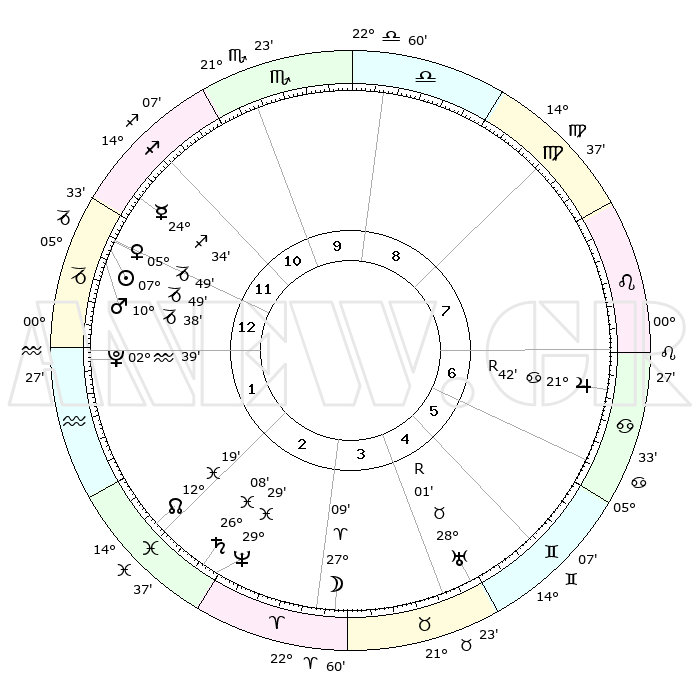 | | ΘΕΣΕΙΣ ΠΛΑΝΗΤΩΝ ΑΣΤΡΟΛΟΓΙΚΟΥ ΧΑΡΤΗ ΤΗΣ ΣΤΙΓΜΗΣ ΑΥΤΗΣ | | | | Πλανήτης | Ζώδιο | Μοίρες | Δεκαήμ. | Σε οίκο | Απόκλιση | | Ακμές των οίκων | | Ηλιος | Αιγόκερως | 07°45' | Πρώτο | 1 | 23 S 12 | | 1ος | 03°23' | Αιγόκερως | | Σελήνη | Κριός | 26°08' | Τρίτο | 4 | 13 N 26 | | 2ος | 11°24' | Υδροχόος | | Ερμής | Τοξότης | 24°27' | Τρίτο | 12 | 23 S 34 | | 3ος | 21°36' | Ιχθείς | | Αφροδίτη | Αιγόκερως | 05°44' | Πρώτο | 1 | 23 S 43 | | 4ος | 24°58' | Κριός | | Αρης | Αιγόκερως | 10°34' | Δεύτερο | 1 | 23 S 53 | | 5ος | 20°46' | Ταύρος | | Δίας | Καρκίνος | 21°43'R | Τρίτο | 7 | 21 N 55 | | 6ος | 12°22' | Δίδυμοι | | Κρόνος | Ιχθείς | 26°08' | Τρίτο | 3 | 03 S 37 | | 7ος | 03°23' | Καρκίνος | | Ουρανός | Ταύρος | 28°01'R | Τρίτο | 5 | 19 N 31 | | 8ος | 11°24' | Λέων | | Ποσειδώνας | Ιχθείς | 29°29' | Τρίτο | 3 | 01 S 26 | | 9ος | 21°36' | Παρθένος | | Πλούτωνας | Υδροχόος | 02°38' | Πρώτο | 1 | 23 S 14 | | 10ος | 24°58' | Ζυγός | | Β. Δεσμός | Ιχθείς | 12°19' | Δεύτερο | 2 | 06 S 56 | | 11ος | 20°46' | Σκορπιός | | Ωροσκόπος | Αιγόκερως | 03°23' | Πρώτο | | | 12ος | 12°22' | Τοξότης | | Μεσουράνημα | Ζυγός | 24°58' | Τρίτο | | | |