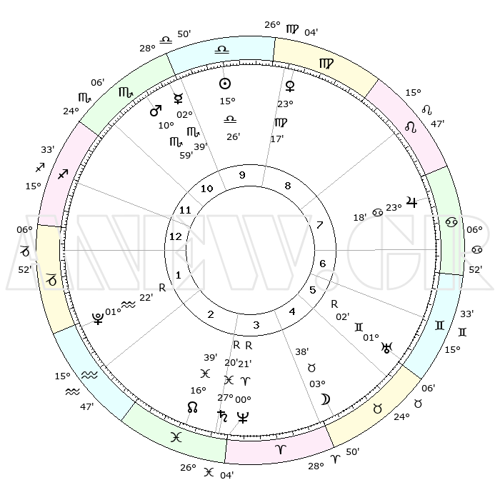 | ΘΕΣΕΙΣ ΠΛΑΝΗΤΩΝ ΑΣΤΡΟΛΟΓΙΚΟΥ ΧΑΡΤΗ ΤΗΣ ΣΤΙΓΜΗΣ ΑΥΤΗΣ | | Πλανήτης | Ζώδιο | Μοίρες | Δεκαήμ. | Σε οίκο | Απόκλιση | | Ακμές των οίκων | Ηλιος | Ζυγός | 15°20' | Δεύτερο | 10 | 06 S 02 | | 1ος | 08°22' | Τοξότης | Σελήνη | Ταύρος | 02°17' | Πρώτο | 5 | 15 N 40 | | 2ος | 10°48' | Αιγόκερως | Ερμής | Σκορπιός | 02°31' | Πρώτο | 11 | 13 S 16 | | 3ος | 17°55' | Υδροχόος | Αφροδίτη | Παρθένος | 23°11' | Τρίτο | 9 | 04 N 02 | | 4ος | 23°58' | Ιχθείς | Αρης | Σκορπιός | 10°55' | Δεύτερο | 11 | 15 S 15 | | 5ος | 23°50' | Κριός | Δίας | Καρκίνος | 23°18' | Τρίτο | 8 | 21 N 27 | | 6ος | 17°46' | Ταύρος | Κρόνος | Ιχθείς | 27°21'R | Τρίτο | 4 | 03 S 21 | | 7ος | 08°22' | Δίδυμοι | Ουρανός | Δίδυμοι | 01°02'R | Πρώτο | 6 | 20 N 09 | | 8ος | 10°48' | Καρκίνος | Ποσειδώνας | Κριός | 00°21'R | Πρώτο | 4 | 01 S 07 | | 9ος | 17°55' | Λέων | Πλούτωνας | Υδροχόος | 01°22'R | Πρώτο | 2 | 23 S 32 | | 10ος | 23°58' | Παρθένος | Β. Δεσμός | Ιχθείς | 16°39' | Δεύτερο | 3 | 05 S 16 | | 11ος | 23°50' | Ζυγός | Ωροσκόπος | Τοξότης | 08°22' | Πρώτο | | | 12ος | 17°46' | Σκορπιός | Μεσουράνημα | Παρθένος | 23°58' | Τρίτο | | | |