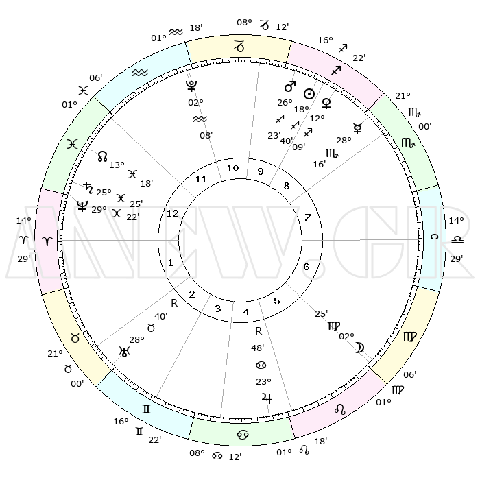 | | ΘΕΣΕΙΣ ΠΛΑΝΗΤΩΝ ΑΣΤΡΟΛΟΓΙΚΟΥ ΧΑΡΤΗ ΤΗΣ ΣΤΙΓΜΗΣ ΑΥΤΗΣ | | | | Πλανήτης | Ζώδιο | Μοίρες | Δεκαήμ. | Σε οίκο | Απόκλιση | | Ακμές των οίκων | | Ηλιος | Τοξότης | 18°37' | Δεύτερο | 9 | 22 S 57 | | 1ος | 17°36' | Ιχθείς | | Σελήνη | Παρθένος | 01°49' | Πρώτο | 6 | 11 N 45 | | 2ος | 00°35' | Ταύρος | | Ερμής | Σκορπιός | 28°13' | Τρίτο | 8 | 17 S 44 | | 3ος | 00°01' | Δίδυμοι | | Αφροδίτη | Τοξότης | 12°05' | Δεύτερο | 9 | 21 S 54 | | 4ος | 22°60' | Δίδυμοι | | Αρης | Τοξότης | 26°21' | Τρίτο | 10 | 24 S 07 | | 5ος | 14°52' | Καρκίνος | | Δίας | Καρκίνος | 23°48'R | Τρίτο | 5 | 21 N 31 | | 6ος | 10°30' | Λέων | | Κρόνος | Ιχθείς | 25°25' | Τρίτο | 1 | 03 S 58 | | 7ος | 17°36' | Παρθένος | | Ουρανός | Ταύρος | 28°40'R | Τρίτο | 2 | 19 N 40 | | 8ος | 00°35' | Σκορπιός | | Ποσειδώνας | Ιχθείς | 29°22'R | Τρίτο | 1 | 01 S 29 | | 9ος | 00°01' | Τοξότης | | Πλούτωνας | Υδροχόος | 02°08' | Πρώτο | 11 | 23 S 21 | | 10ος | 22°60' | Τοξότης | | Β. Δεσμός | Ιχθείς | 13°19' | Δεύτερο | 12 | 06 S 33 | | 11ος | 14°52' | Αιγόκερως | | Ωροσκόπος | Ιχθείς | 17°36' | Δεύτερο | | | 12ος | 10°30' | Υδροχόος | | Μεσουράνημα | Τοξότης | 22°60' | Τρίτο | | | |