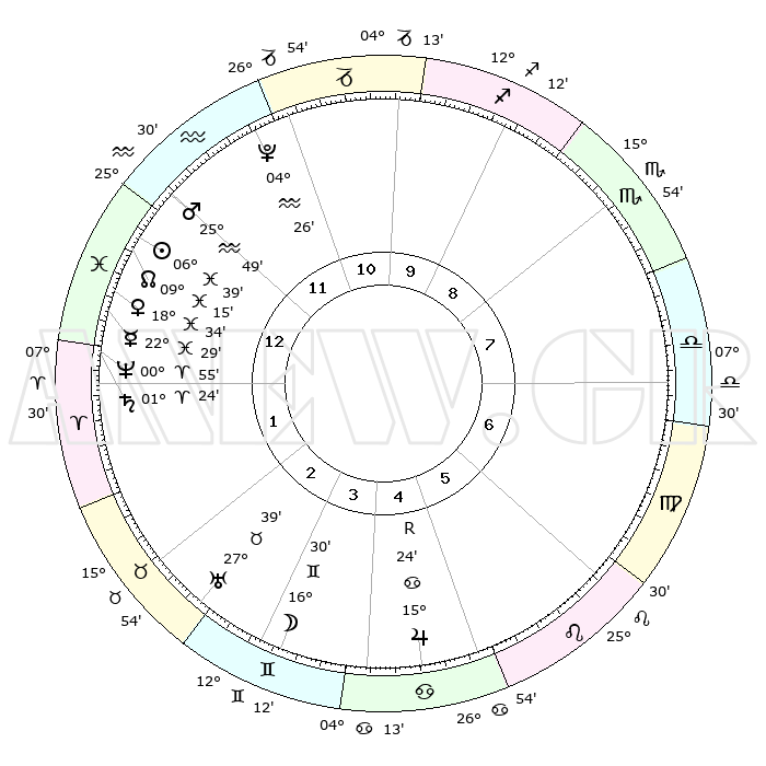 | | ΘΕΣΕΙΣ ΠΛΑΝΗΤΩΝ ΑΣΤΡΟΛΟΓΙΚΟΥ ΧΑΡΤΗ ΤΗΣ ΣΤΙΓΜΗΣ ΑΥΤΗΣ | | | | Πλανήτης | Ζώδιο | Μοίρες | Δεκαήμ. | Σε οίκο | Απόκλιση | | Ακμές των οίκων | | Ηλιος | Ιχθείς | 06°36' | Πρώτο | 1 | 09 S 05 | | 1ος | 06°24' | Ιχθείς | | Σελήνη | Δίδυμοι | 15°45' | Δεύτερο | 3 | 27 N 53 | | 2ος | 21°11' | Κριός | | Ερμής | Ιχθείς | 22°28' | Τρίτο | 1 | 00 S 39 | | 3ος | 22°39' | Ταύρος | | Αφροδίτη | Ιχθείς | 18°30' | Δεύτερο | 1 | 05 S 51 | | 4ος | 16°28' | Δίδυμοι | | Αρης | Υδροχόος | 25°46' | Τρίτο | 12 | 13 S 57 | | 5ος | 08°09' | Καρκίνος | | Δίας | Καρκίνος | 15°24'R | Δεύτερο | 5 | 22 N 53 | | 6ος | 02°24' | Λέων | | Κρόνος | Κριός | 01°23' | Πρώτο | 1 | 01 S 24 | | 7ος | 06°24' | Παρθένος | | Ουρανός | Ταύρος | 27°39' | Τρίτο | 3 | 19 N 27 | | 8ος | 21°11' | Ζυγός | | Ποσειδώνας | Κριός | 00°55' | Πρώτο | 1 | 00 S 50 | | 9ος | 22°39' | Σκορπιός | | Πλούτωνας | Υδροχόος | 04°26' | Πρώτο | 12 | 22 S 53 | | 10ος | 16°28' | Τοξότης | | Β. Δεσμός | Ιχθείς | 09°15' | Πρώτο | 1 | 08 S 06 | | 11ος | 08°09' | Αιγόκερως | | Ωροσκόπος | Ιχθείς | 06°24' | Πρώτο | | | 12ος | 02°24' | Υδροχόος | | Μεσουράνημα | Τοξότης | 16°28' | Δεύτερο | | | |