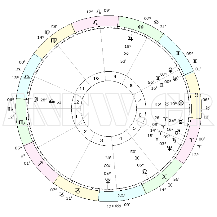 | | ΘΕΣΕΙΣ ΠΛΑΝΗΤΩΝ ΑΣΤΡΟΛΟΓΙΚΟΥ ΧΑΡΤΗ ΤΗΣ ΣΤΙΓΜΗΣ ΑΥΤΗΣ | | | | Πλανήτης | Ζώδιο | Μοίρες | Δεκαήμ. | Σε οίκο | Απόκλιση | | Ακμές των οίκων | | Ηλιος | Ταύρος | 10°19' | Δεύτερο | 7 | 14 N 55 | | 1ος | 22°27' | Ζυγός | | Σελήνη | Ζυγός | 28°18' | Τρίτο | 1 | 14 S 33 | | 2ος | 20°26' | Σκορπιός | | Ερμής | Κριός | 25°20' | Τρίτο | 7 | 07 N 58 | | 3ος | 21°52' | Τοξότης | | Αφροδίτη | Δίδυμοι | 07°53' | Πρώτο | 8 | 22 N 29 | | 4ος | 25°35' | Αιγόκερως | | Αρης | Κριός | 16°07' | Δεύτερο | 6 | 05 N 31 | | 5ος | 28°32' | Υδροχόος | | Δίας | Καρκίνος | 18°52' | Δεύτερο | 9 | 22 N 29 | | 6ος | 27°49' | Ιχθείς | | Κρόνος | Κριός | 09°13' | Πρώτο | 6 | 01 N 39 | | 7ος | 22°27' | Κριός | | Ουρανός | Δίδυμοι | 00°16' | Πρώτο | 8 | 20 N 02 | | 8ος | 20°26' | Ταύρος | | Ποσειδώνας | Κριός | 03°15' | Πρώτο | 6 | 00 N 05 | | 9ος | 21°52' | Δίδυμοι | | Πλούτωνας | Υδροχόος | 05°30' | Πρώτο | 4 | 22 S 49 | | 10ος | 25°35' | Καρκίνος | | Β. Δεσμός | Ιχθείς | 05°50' | Πρώτο | 5 | 09 S 22 | | 11ος | 28°32' | Λέων | | Ωροσκόπος | Ζυγός | 22°27' | Τρίτο | | | 12ος | 27°49' | Παρθένος | | Μεσουράνημα | Καρκίνος | 25°35' | Τρίτο | | | |