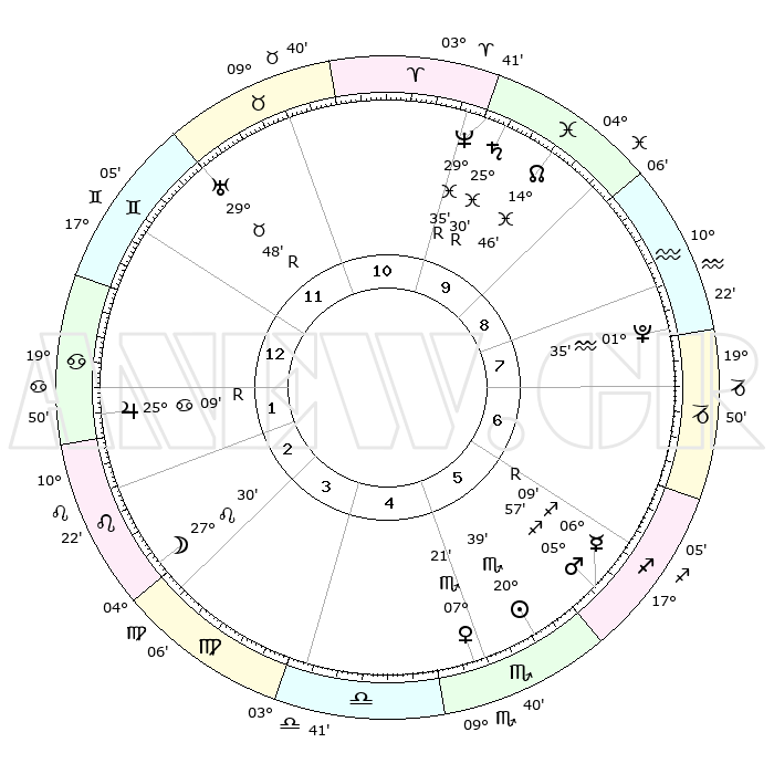 | | ΘΕΣΕΙΣ ΠΛΑΝΗΤΩΝ ΑΣΤΡΟΛΟΓΙΚΟΥ ΧΑΡΤΗ ΤΗΣ ΣΤΙΓΜΗΣ ΑΥΤΗΣ | | | | Πλανήτης | Ζώδιο | Μοίρες | Δεκαήμ. | Σε οίκο | Απόκλιση | | Ακμές των οίκων | | Ηλιος | Σκορπιός | 20°35' | Τρίτο | 6 | 17 S 54 | | 1ος | 27°16' | Δίδυμοι | | Σελήνη | Λέων | 26°35' | Τρίτο | 3 | 14 N 15 | | 2ος | 18°14' | Καρκίνος | | Ερμής | Τοξότης | 06°11'R | Πρώτο | 6 | 23 S 07 | | 3ος | 09°52' | Λέων | | Αφροδίτη | Σκορπιός | 07°16' | Πρώτο | 5 | 12 S 44 | | 4ος | 05°46' | Παρθένος | | Αρης | Τοξότης | 05°54' | Πρώτο | 6 | 21 S 47 | | 5ος | 09°15' | Ζυγός | | Δίας | Καρκίνος | 25°09'R | Τρίτο | 2 | 21 N 13 | | 6ος | 19°25' | Σκορπιός | | Κρόνος | Ιχθείς | 25°30'R | Τρίτο | 10 | 04 S 01 | | 7ος | 27°16' | Τοξότης | | Ουρανός | Ταύρος | 29°48'R | Τρίτο | 12 | 19 N 54 | | 8ος | 18°14' | Αιγόκερως | | Ποσειδώνας | Ιχθείς | 29°35'R | Τρίτο | 10 | 01 S 25 | | 9ος | 09°52' | Υδροχόος | | Πλούτωνας | Υδροχόος | 01°35' | Πρώτο | 8 | 23 S 29 | | 10ος | 05°46' | Ιχθείς | | Β. Δεσμός | Ιχθείς | 14°47' | Δεύτερο | 10 | 06 S 00 | | 11ος | 09°15' | Κριός | | Ωροσκόπος | Δίδυμοι | 27°16' | Τρίτο | | | 12ος | 19°25' | Ταύρος | | Μεσουράνημα | Ιχθείς | 05°46' | Πρώτο | | | |