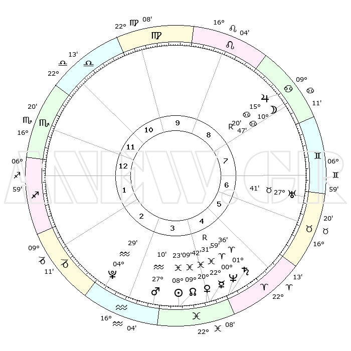 | | ΘΕΣΕΙΣ ΠΛΑΝΗΤΩΝ ΑΣΤΡΟΛΟΓΙΚΟΥ ΧΑΡΤΗ ΤΗΣ ΣΤΙΓΜΗΣ ΑΥΤΗΣ | | | | Πλανήτης | Ζώδιο | Μοίρες | Δεκαήμ. | Σε οίκο | Απόκλιση | | Ακμές των οίκων | | Ηλιος | Ιχθείς | 08°20' | Πρώτο | 4 | 08 S 27 | | 1ος | 21°57' | Σκορπιός | | Σελήνη | Καρκίνος | 10°04' | Δεύτερο | 8 | 27 N 34 | | 2ος | 22°06' | Τοξότης | | Ερμής | Ιχθείς | 22°32'R | Τρίτο | 4 | 00 S 17 | | 3ος | 26°32' | Αιγόκερως | | Αφροδίτη | Ιχθείς | 20°38' | Τρίτο | 4 | 04 S 59 | | 4ος | 02°15' | Ιχθείς | | Αρης | Υδροχόος | 27°07' | Τρίτο | 3 | 13 S 30 | | 5ος | 04°09' | Κριός | | Δίας | Καρκίνος | 15°20'R | Δεύτερο | 8 | 22 N 54 | | 6ος | 00°17' | Ταύρος | | Κρόνος | Κριός | 01°36' | Πρώτο | 4 | 01 S 20 | | 7ος | 21°57' | Ταύρος | | Ουρανός | Ταύρος | 27°41' | Τρίτο | 7 | 19 N 28 | | 8ος | 22°06' | Δίδυμοι | | Ποσειδώνας | Κριός | 00°59' | Πρώτο | 4 | 00 S 49 | | 9ος | 26°32' | Καρκίνος | | Πλούτωνας | Υδροχόος | 04°29' | Πρώτο | 3 | 22 S 53 | | 10ος | 02°15' | Παρθένος | | Β. Δεσμός | Ιχθείς | 09°09' | Πρώτο | 4 | 08 S 08 | | 11ος | 04°09' | Ζυγός | | Ωροσκόπος | Σκορπιός | 21°57' | Τρίτο | | | 12ος | 00°17' | Σκορπιός | | Μεσουράνημα | Παρθένος | 02°15' | Πρώτο | | | |