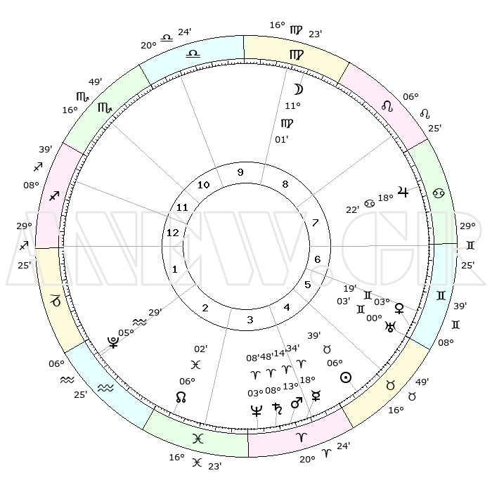 | | ΘΕΣΕΙΣ ΠΛΑΝΗΤΩΝ ΑΣΤΡΟΛΟΓΙΚΟΥ ΧΑΡΤΗ ΤΗΣ ΣΤΙΓΜΗΣ ΑΥΤΗΣ | | | | Πλανήτης | Ζώδιο | Μοίρες | Δεκαήμ. | Σε οίκο | Απόκλιση | | Ακμές των οίκων | | Ηλιος | Ταύρος | 06°36' | Πρώτο | 5 | 13 N 43 | | 1ος | 10°31' | Τοξότης | | Σελήνη | Παρθένος | 10°14' | Δεύτερο | 9 | 07 N 30 | | 2ος | 13°20' | Αιγόκερως | | Ερμής | Κριός | 18°27' | Δεύτερο | 4 | 05 N 06 | | 3ος | 20°48' | Υδροχόος | | Αφροδίτη | Δίδυμοι | 03°15' | Πρώτο | 6 | 21 N 30 | | 4ος | 26°46' | Ιχθείς | | Αρης | Κριός | 13°11' | Δεύτερο | 4 | 04 N 22 | | 5ος | 26°18' | Κριός | | Δίας | Καρκίνος | 18°21' | Δεύτερο | 8 | 22 N 34 | | 6ος | 19°59' | Ταύρος | | Κρόνος | Κριός | 08°47' | Πρώτο | 4 | 01 N 30 | | 7ος | 10°31' | Δίδυμοι | | Ουρανός | Δίδυμοι | 00°03' | Πρώτο | 6 | 20 N 00 | | 8ος | 13°20' | Καρκίνος | | Ποσειδώνας | Κριός | 03°08' | Πρώτο | 4 | 00 N 02 | | 9ος | 20°48' | Λέων | | Πλούτωνας | Υδροχόος | 05°29' | Πρώτο | 2 | 22 S 48 | | 10ος | 26°46' | Παρθένος | | Β. Δεσμός | Ιχθείς | 06°02' | Πρώτο | 3 | 09 S 18 | | 11ος | 26°18' | Ζυγός | | Ωροσκόπος | Τοξότης | 10°31' | Δεύτερο | | | 12ος | 19°59' | Σκορπιός | | Μεσουράνημα | Παρθένος | 26°46' | Τρίτο | | | |