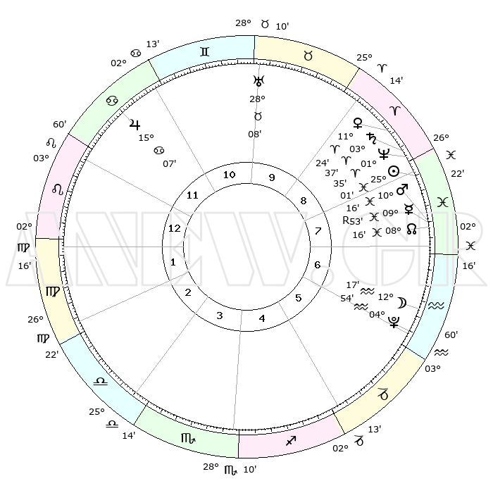 | | ΘΕΣΕΙΣ ΠΛΑΝΗΤΩΝ ΑΣΤΡΟΛΟΓΙΚΟΥ ΧΑΡΤΗ ΤΗΣ ΣΤΙΓΜΗΣ ΑΥΤΗΣ | | | | Πλανήτης | Ζώδιο | Μοίρες | Δεκαήμ. | Σε οίκο | Απόκλιση | | Ακμές των οίκων | | Ηλιος | Ιχθείς | 24°58' | Τρίτο | 8 | 02 S 00 | | 1ος | 15°57' | Λέων | | Σελήνη | Υδροχόος | 11°34' | Δεύτερο | 6 | 19 S 39 | | 2ος | 08°21' | Παρθένος | | Ερμής | Ιχθείς | 09°55'R | Πρώτο | 8 | 05 S 44 | | 3ος | 05°31' | Ζυγός | | Αφροδίτη | Κριός | 11°19' | Δεύτερο | 9 | 03 N 32 | | 4ος | 07°59' | Σκορπιός | | Αρης | Ιχθείς | 10°13' | Δεύτερο | 8 | 08 S 44 | | 5ος | 13°11' | Τοξότης | | Δίας | Καρκίνος | 15°07' | Δεύτερο | 11 | 22 N 56 | | 6ος | 16°33' | Αιγόκερως | | Κρόνος | Κριός | 03°37' | Πρώτο | 8 | 00 S 31 | | 7ος | 15°57' | Υδροχόος | | Ουρανός | Ταύρος | 28°08' | Τρίτο | 10 | 19 N 34 | | 8ος | 08°21' | Ιχθείς | | Ποσειδώνας | Κριός | 01°35' | Πρώτο | 8 | 00 S 34 | | 9ος | 05°31' | Κριός | | Πλούτωνας | Υδροχόος | 04°54' | Πρώτο | 6 | 22 S 49 | | 10ος | 07°59' | Ταύρος | | Β. Δεσμός | Ιχθείς | 08°16' | Πρώτο | 7 | 08 S 28 | | 11ος | 13°11' | Δίδυμοι | | Ωροσκόπος | Λέων | 15°57' | Δεύτερο | | | 12ος | 16°33' | Καρκίνος | | Μεσουράνημα | Ταύρος | 07°59' | Πρώτο | | | |