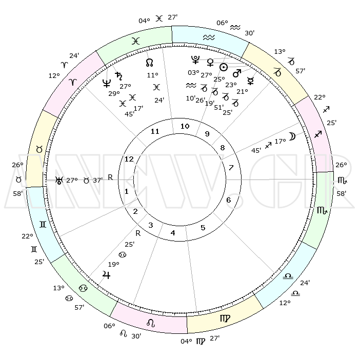 | | ΘΕΣΕΙΣ ΠΛΑΝΗΤΩΝ ΑΣΤΡΟΛΟΓΙΚΟΥ ΧΑΡΤΗ ΤΗΣ ΣΤΙΓΜΗΣ ΑΥΤΗΣ | | | | Πλανήτης | Ζώδιο | Μοίρες | Δεκαήμ. | Σε οίκο | Απόκλιση | | Ακμές των οίκων | | Ηλιος | Αιγόκερως | 25°15' | Τρίτο | 10 | 21 S 05 | | 1ος | 25°18' | Κριός | | Σελήνη | Τοξότης | 16°59' | Δεύτερο | 8 | 27 S 51 | | 2ος | 28°50' | Ταύρος | | Ερμής | Αιγόκερως | 21°18' | Τρίτο | 10 | 23 S 32 | | 3ος | 22°53' | Δίδυμοι | | Αφροδίτη | Αιγόκερως | 27°21' | Τρίτο | 10 | 21 S 39 | | 4ος | 14°35' | Καρκίνος | | Αρης | Αιγόκερως | 23°48' | Τρίτο | 10 | 22 S 18 | | 5ος | 08°32' | Λέων | | Δίας | Καρκίνος | 19°25'R | Δεύτερο | 4 | 22 N 18 | | 6ος | 10°20' | Παρθένος | | Κρόνος | Ιχθείς | 27°17' | Τρίτο | 12 | 03 S 07 | | 7ος | 25°18' | Ζυγός | | Ουρανός | Ταύρος | 27°37'R | Τρίτο | 1 | 19 N 26 | | 8ος | 28°50' | Σκορπιός | | Ποσειδώνας | Ιχθείς | 29°45' | Τρίτο | 12 | 01 S 19 | | 9ος | 22°53' | Τοξότης | | Πλούτωνας | Υδροχόος | 03°10' | Πρώτο | 10 | 23 S 08 | | 10ος | 14°35' | Αιγόκερως | | Β. Δεσμός | Ιχθείς | 11°24' | Δεύτερο | 12 | 07 S 17 | | 11ος | 08°32' | Υδροχόος | | Ωροσκόπος | Κριός | 25°18' | Τρίτο | | | 12ος | 10°20' | Ιχθείς | | Μεσουράνημα | Αιγόκερως | 14°35' | Δεύτερο | | | |