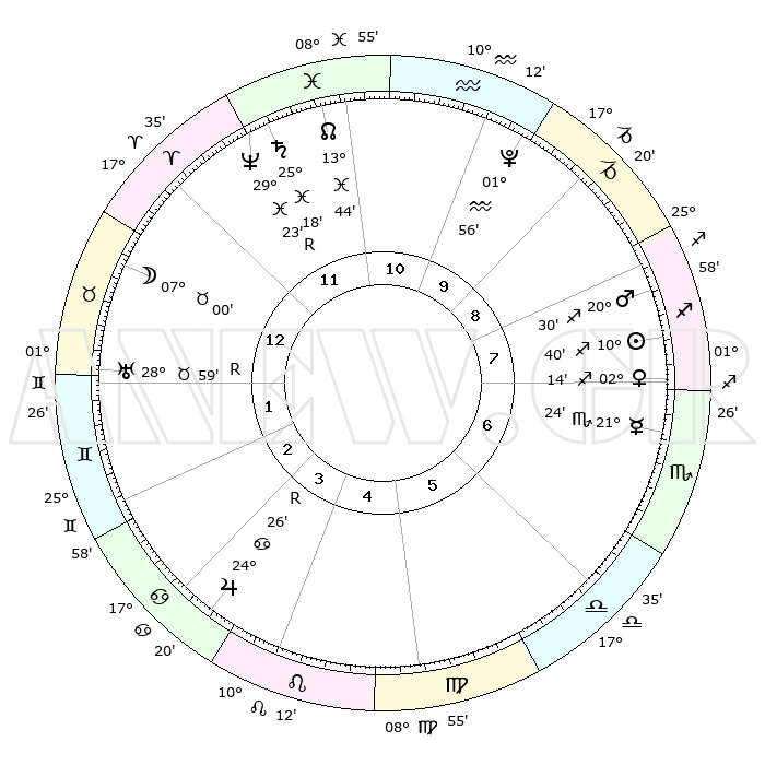 | | ΘΕΣΕΙΣ ΠΛΑΝΗΤΩΝ ΑΣΤΡΟΛΟΓΙΚΟΥ ΧΑΡΤΗ ΤΗΣ ΣΤΙΓΜΗΣ ΑΥΤΗΣ | | | | Πλανήτης | Ζώδιο | Μοίρες | Δεκαήμ. | Σε οίκο | Απόκλιση | | Ακμές των οίκων | | Ηλιος | Τοξότης | 10°38' | Δεύτερο | 7 | 22 S 02 | | 1ος | 14°49' | Ταύρος | | Σελήνη | Ταύρος | 06°27' | Πρώτο | 12 | 17 N 25 | | 2ος | 13°05' | Δίδυμοι | | Ερμής | Σκορπιός | 21°23' | Τρίτο | 7 | 15 S 35 | | 3ος | 05°21' | Καρκίνος | | Αφροδίτη | Τοξότης | 02°11' | Πρώτο | 7 | 19 S 57 | | 4ος | 27°18' | Καρκίνος | | Αρης | Τοξότης | 20°28' | Τρίτο | 8 | 23 S 46 | | 5ος | 23°26' | Λέων | | Δίας | Καρκίνος | 24°26'R | Τρίτο | 3 | 21 N 23 | | 6ος | 29°06' | Παρθένος | | Κρόνος | Ιχθείς | 25°18' | Τρίτο | 11 | 04 S 02 | | 7ος | 14°49' | Σκορπιός | | Ουρανός | Ταύρος | 28°59'R | Τρίτο | 1 | 19 N 44 | | 8ος | 13°05' | Τοξότης | | Ποσειδώνας | Ιχθείς | 29°23'R | Τρίτο | 12 | 01 S 29 | | 9ος | 05°21' | Αιγόκερως | | Πλούτωνας | Υδροχόος | 01°56' | Πρώτο | 10 | 23 S 24 | | 10ος | 27°18' | Αιγόκερως | | Β. Δεσμός | Ιχθείς | 13°44' | Δεύτερο | 11 | 06 S 24 | | 11ος | 23°26' | Υδροχόος | | Ωροσκόπος | Ταύρος | 14°49' | Δεύτερο | | | 12ος | 29°06' | Ιχθείς | | Μεσουράνημα | Αιγόκερως | 27°18' | Τρίτο | | | |