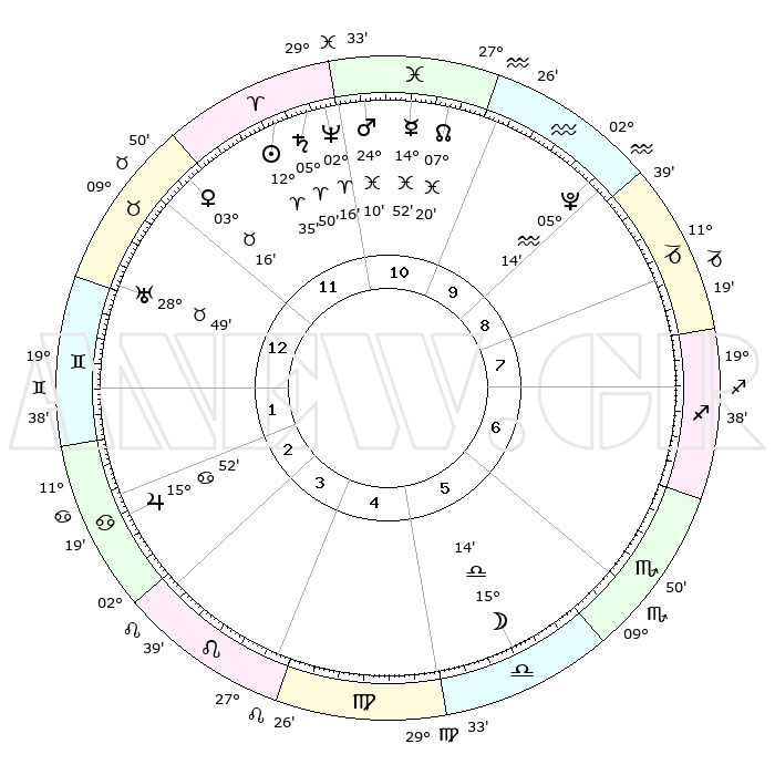 | | ΘΕΣΕΙΣ ΠΛΑΝΗΤΩΝ ΑΣΤΡΟΛΟΓΙΚΟΥ ΧΑΡΤΗ ΤΗΣ ΣΤΙΓΜΗΣ ΑΥΤΗΣ | | | | Πλανήτης | Ζώδιο | Μοίρες | Δεκαήμ. | Σε οίκο | Απόκλιση | | Ακμές των οίκων | | Ηλιος | Κριός | 12°31' | Δεύτερο | 12 | 04 N 57 | | 1ος | 21°37' | Ταύρος | | Σελήνη | Ζυγός | 14°22' | Δεύτερο | 6 | 08 S 27 | | 2ος | 18°15' | Δίδυμοι | | Ερμής | Ιχθείς | 14°48' | Δεύτερο | 11 | 07 S 22 | | 3ος | 10°03' | Καρκίνος | | Αφροδίτη | Ταύρος | 03°11' | Πρώτο | 12 | 12 N 12 | | 4ος | 02°18' | Λέων | | Αρης | Ιχθείς | 24°06' | Τρίτο | 11 | 03 S 18 | | 5ος | 29°24' | Λέων | | Δίας | Καρκίνος | 15°52' | Δεύτερο | 3 | 22 N 52 | | 6ος | 06°23' | Ζυγός | | Κρόνος | Κριός | 05°49' | Πρώτο | 11 | 00 N 21 | | 7ος | 21°37' | Σκορπιός | | Ουρανός | Ταύρος | 28°49' | Τρίτο | 1 | 19 N 43 | | 8ος | 18°15' | Τοξότης | | Ποσειδώνας | Κριός | 02°15' | Πρώτο | 11 | 00 S 18 | | 9ος | 10°03' | Αιγόκερως | | Πλούτωνας | Υδροχόος | 05°14' | Πρώτο | 10 | 22 S 47 | | 10ος | 02°18' | Υδροχόος | | Β. Δεσμός | Ιχθείς | 07°20' | Πρώτο | 11 | 08 S 49 | | 11ος | 29°24' | Υδροχόος | | Ωροσκόπος | Ταύρος | 21°37' | Τρίτο | | | 12ος | 06°23' | Κριός | | Μεσουράνημα | Υδροχόος | 02°18' | Πρώτο | | | |