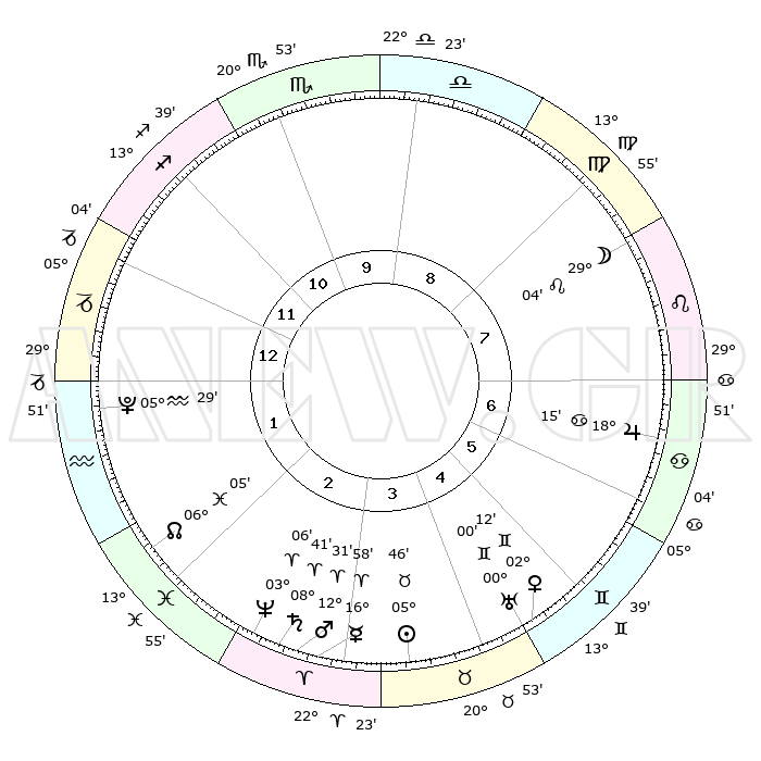 | | ΘΕΣΕΙΣ ΠΛΑΝΗΤΩΝ ΑΣΤΡΟΛΟΓΙΚΟΥ ΧΑΡΤΗ ΤΗΣ ΣΤΙΓΜΗΣ ΑΥΤΗΣ | | | | Πλανήτης | Ζώδιο | Μοίρες | Δεκαήμ. | Σε οίκο | Απόκλιση | | Ακμές των οίκων | | Ηλιος | Ταύρος | 05°43' | Πρώτο | 4 | 13 N 25 | | 1ος | 08°55' | Αιγόκερως | | Σελήνη | Λέων | 28°21' | Τρίτο | 8 | 12 N 47 | | 2ος | 18°20' | Υδροχόος | | Ερμής | Κριός | 16°53' | Δεύτερο | 3 | 04 N 26 | | 3ος | 28°39' | Ιχθείς | | Αφροδίτη | Δίδυμοι | 02°08' | Πρώτο | 5 | 21 N 15 | | 4ος | 01°02' | Ταύρος | | Αρης | Κριός | 12°29' | Δεύτερο | 3 | 04 N 05 | | 5ος | 26°01' | Ταύρος | | Δίας | Καρκίνος | 18°14' | Δεύτερο | 7 | 22 N 35 | | 6ος | 17°23' | Δίδυμοι | | Κρόνος | Κριός | 08°41' | Πρώτο | 3 | 01 N 27 | | 7ος | 08°55' | Καρκίνος | | Ουρανός | Ταύρος | 29°60' | Τρίτο | 5 | 19 N 59 | | 8ος | 18°20' | Λέων | | Ποσειδώνας | Κριός | 03°06' | Πρώτο | 3 | 00 N 01 | | 9ος | 28°39' | Παρθένος | | Πλούτωνας | Υδροχόος | 05°29' | Πρώτο | 1 | 22 S 48 | | 10ος | 01°02' | Σκορπιός | | Β. Δεσμός | Ιχθείς | 06°05' | Πρώτο | 2 | 09 S 17 | | 11ος | 26°01' | Σκορπιός | | Ωροσκόπος | Αιγόκερως | 08°55' | Πρώτο | | | 12ος | 17°23' | Τοξότης | | Μεσουράνημα | Σκορπιός | 01°02' | Πρώτο | | | |