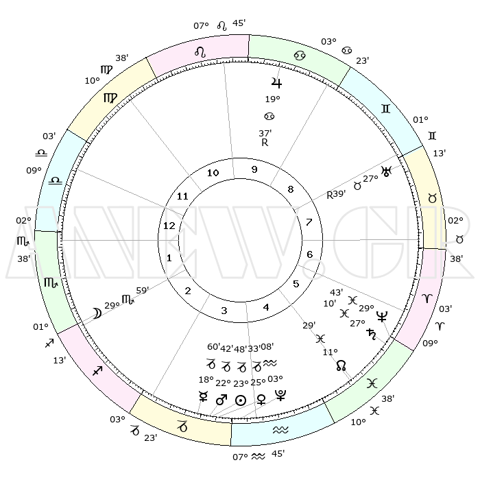 | | ΘΕΣΕΙΣ ΠΛΑΝΗΤΩΝ ΑΣΤΡΟΛΟΓΙΚΟΥ ΧΑΡΤΗ ΤΗΣ ΣΤΙΓΜΗΣ ΑΥΤΗΣ | | | | Πλανήτης | Ζώδιο | Μοίρες | Δεκαήμ. | Σε οίκο | Απόκλιση | | Ακμές των οίκων | | Ηλιος | Αιγόκερως | 23°43' | Τρίτο | 4 | 21 S 21 | | 1ος | 11°06' | Ζυγός | | Σελήνη | Σκορπιός | 29°07' | Τρίτο | 2 | 24 S 52 | | 2ος | 08°25' | Σκορπιός | | Ερμής | Αιγόκερως | 18°53' | Δεύτερο | 4 | 23 S 48 | | 3ος | 09°17' | Τοξότης | | Αφροδίτη | Αιγόκερως | 25°27' | Τρίτο | 4 | 21 S 58 | | 4ος | 12°31' | Αιγόκερως | | Αρης | Αιγόκερως | 22°39' | Τρίτο | 4 | 22 S 29 | | 5ος | 15°26' | Υδροχόος | | Δίας | Καρκίνος | 19°38'R | Δεύτερο | 10 | 22 N 16 | | 6ος | 15°24' | Ιχθείς | | Κρόνος | Ιχθείς | 27°10' | Τρίτο | 6 | 03 S 10 | | 7ος | 11°06' | Κριός | | Ουρανός | Ταύρος | 27°39'R | Τρίτο | 8 | 19 N 26 | | 8ος | 08°25' | Ταύρος | | Ποσειδώνας | Ιχθείς | 29°43' | Τρίτο | 6 | 01 S 20 | | 9ος | 09°17' | Δίδυμοι | | Πλούτωνας | Υδροχόος | 03°07' | Πρώτο | 4 | 23 S 08 | | 10ος | 12°31' | Καρκίνος | | Β. Δεσμός | Ιχθείς | 11°29' | Δεύτερο | 5 | 07 S 15 | | 11ος | 15°26' | Λέων | | Ωροσκόπος | Ζυγός | 11°06' | Δεύτερο | | | 12ος | 15°24' | Παρθένος | | Μεσουράνημα | Καρκίνος | 12°31' | Δεύτερο | | | |