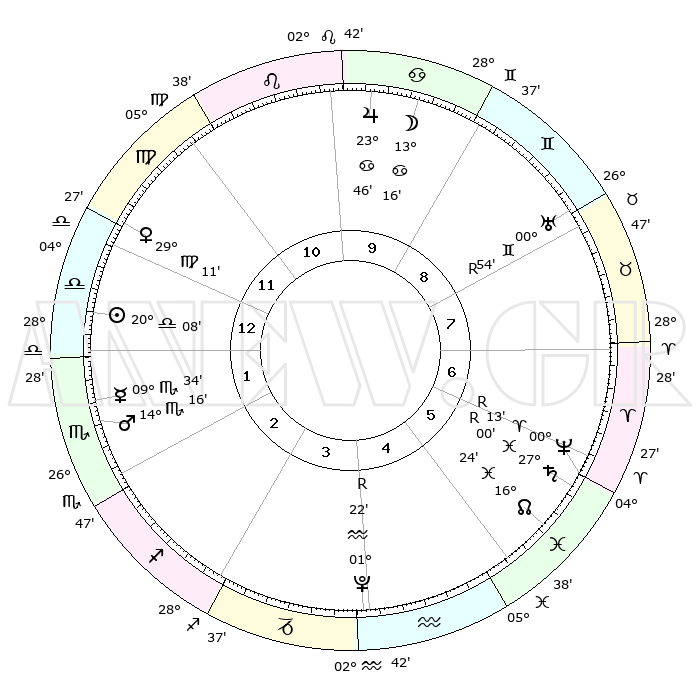 | ΘΕΣΕΙΣ ΠΛΑΝΗΤΩΝ ΑΣΤΡΟΛΟΓΙΚΟΥ ΧΑΡΤΗ ΤΗΣ ΣΤΙΓΜΗΣ ΑΥΤΗΣ | | Πλανήτης | Ζώδιο | Μοίρες | Δεκαήμ. | Σε οίκο | Απόκλιση | | Ακμές των οίκων | Ηλιος | Ζυγός | 20°02' | Τρίτο | 1 | 07 S 50 | | 1ος | 28°41' | Παρθένος | Σελήνη | Καρκίνος | 11°51' | Δεύτερο | 10 | 27 N 39 | | 2ος | 25°10' | Ζυγός | Ερμής | Σκορπιός | 09°25' | Πρώτο | 2 | 16 S 04 | | 3ος | 25°33' | Σκορπιός | Αφροδίτη | Παρθένος | 29°03' | Τρίτο | 1 | 01 N 45 | | 4ος | 28°31' | Τοξότης | Αρης | Σκορπιός | 14°12' | Δεύτερο | 2 | 16 S 18 | | 5ος | 01°31' | Υδροχόος | Δίας | Καρκίνος | 23°46' | Τρίτο | 10 | 21 N 23 | | 6ος | 01°60' | Ιχθείς | Κρόνος | Ιχθείς | 27°01'R | Τρίτο | 6 | 03 S 29 | | 7ος | 28°41' | Ιχθείς | Ουρανός | Δίδυμοι | 00°55'R | Πρώτο | 9 | 20 N 08 | | 8ος | 25°10' | Κριός | Ποσειδώνας | Κριός | 00°13'R | Πρώτο | 7 | 01 S 10 | | 9ος | 25°33' | Ταύρος | Πλούτωνας | Υδροχόος | 01°22'R | Πρώτο | 4 | 23 S 32 | | 10ος | 28°31' | Δίδυμοι | Β. Δεσμός | Ιχθείς | 16°24' | Δεύτερο | 6 | 05 S 22 | | 11ος | 01°31' | Λέων | Ωροσκόπος | Παρθένος | 28°41' | Τρίτο | | | 12ος | 01°60' | Παρθένος | Μεσουράνημα | Δίδυμοι | 28°31' | Τρίτο | | | |