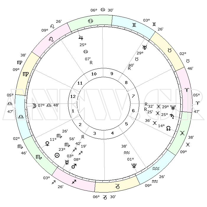 | | ΘΕΣΕΙΣ ΠΛΑΝΗΤΩΝ ΑΣΤΡΟΛΟΓΙΚΟΥ ΧΑΡΤΗ ΤΗΣ ΣΤΙΓΜΗΣ ΑΥΤΗΣ | | | | Πλανήτης | Ζώδιο | Μοίρες | Δεκαήμ. | Σε οίκο | Απόκλιση | | Ακμές των οίκων | | Ηλιος | Σκορπιός | 23°52' | Τρίτο | 3 | 18 S 44 | | 1ος | 19°12' | Παρθένος | | Σελήνη | Ζυγός | 07°07' | Πρώτο | 1 | 04 S 30 | | 2ος | 14°56' | Ζυγός | | Ερμής | Τοξότης | 03°45'R | Πρώτο | 3 | 21 S 48 | | 3ος | 14°54' | Σκορπιός | | Αφροδίτη | Σκορπιός | 11°21' | Δεύτερο | 2 | 14 S 07 | | 4ος | 17°50' | Τοξότης | | Αρης | Τοξότης | 08°17' | Πρώτο | 3 | 22 S 12 | | 5ος | 21°03' | Αιγόκερως | | Δίας | Καρκίνος | 25°07'R | Τρίτο | 11 | 21 N 13 | | 6ος | 21°54' | Υδροχόος | | Κρόνος | Ιχθείς | 25°25'R | Τρίτο | 7 | 04 S 03 | | 7ος | 19°12' | Ιχθείς | | Ουρανός | Ταύρος | 29°40'R | Τρίτο | 9 | 19 N 52 | | 8ος | 14°56' | Κριός | | Ποσειδώνας | Ιχθείς | 29°32'R | Τρίτο | 7 | 01 S 26 | | 9ος | 14°54' | Ταύρος | | Πλούτωνας | Υδροχόος | 01°38' | Πρώτο | 5 | 23 S 28 | | 10ος | 17°50' | Δίδυμοι | | Β. Δεσμός | Ιχθείς | 14°36' | Δεύτερο | 6 | 06 S 04 | | 11ος | 21°03' | Καρκίνος | | Ωροσκόπος | Παρθένος | 19°12' | Δεύτερο | | | 12ος | 21°54' | Λέων | | Μεσουράνημα | Δίδυμοι | 17°50' | Δεύτερο | | | |
