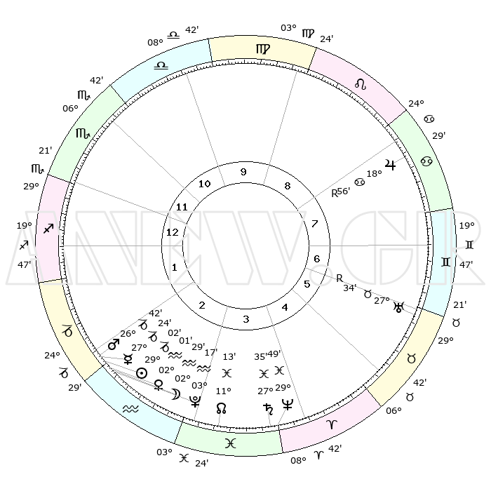 | | ΘΕΣΕΙΣ ΠΛΑΝΗΤΩΝ ΑΣΤΡΟΛΟΓΙΚΟΥ ΧΑΡΤΗ ΤΗΣ ΣΤΙΓΜΗΣ ΑΥΤΗΣ | | | | Πλανήτης | Ζώδιο | Μοίρες | Δεκαήμ. | Σε οίκο | Απόκλιση | | Ακμές των οίκων | | Ηλιος | Αιγόκερως | 28°58' | Τρίτο | 2 | 20 S 22 | | 1ος | 28°45' | Σκορπιός | | Σελήνη | Υδροχόος | 01°36' | Πρώτο | 2 | 22 S 53 | | 2ος | 29°42' | Τοξότης | | Ερμής | Αιγόκερως | 27°17' | Τρίτο | 2 | 22 S 38 | | 3ος | 05°12' | Υδροχόος | | Αφροδίτη | Υδροχόος | 01°56' | Πρώτο | 2 | 20 S 47 | | 4ος | 11°13' | Ιχθείς | | Αρης | Αιγόκερως | 26°38' | Τρίτο | 2 | 21 S 48 | | 5ος | 12°24' | Κριός | | Δίας | Καρκίνος | 18°56'R | Δεύτερο | 8 | 22 N 22 | | 6ος | 07°37' | Ταύρος | | Κρόνος | Ιχθείς | 27°34' | Τρίτο | 4 | 02 S 59 | | 7ος | 28°45' | Ταύρος | | Ουρανός | Ταύρος | 27°34'R | Τρίτο | 6 | 19 N 25 | | 8ος | 29°42' | Δίδυμοι | | Ποσειδώνας | Ιχθείς | 29°49' | Τρίτο | 4 | 01 S 17 | | 9ος | 05°12' | Λέων | | Πλούτωνας | Υδροχόος | 03°17' | Πρώτο | 2 | 23 S 06 | | 10ος | 11°13' | Παρθένος | | Β. Δεσμός | Ιχθείς | 11°13' | Δεύτερο | 3 | 07 S 21 | | 11ος | 12°24' | Ζυγός | | Ωροσκόπος | Σκορπιός | 28°45' | Τρίτο | | | 12ος | 07°37' | Σκορπιός | | Μεσουράνημα | Παρθένος | 11°13' | Δεύτερο | | | |