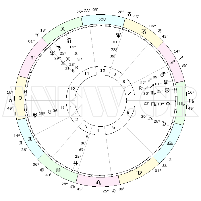 | | ΘΕΣΕΙΣ ΠΛΑΝΗΤΩΝ ΑΣΤΡΟΛΟΓΙΚΟΥ ΧΑΡΤΗ ΤΗΣ ΣΤΙΓΜΗΣ ΑΥΤΗΣ | | | | Πλανήτης | Ζώδιο | Μοίρες | Δεκαήμ. | Σε οίκο | Απόκλιση | | Ακμές των οίκων | | Ηλιος | Σκορπιός | 25°25' | Τρίτο | 8 | 19 S 07 | | 1ος | 01°17' | Κριός | | Σελήνη | Ζυγός | 25°31' | Τρίτο | 7 | 12 S 51 | | 2ος | 11°16' | Ταύρος | | Ερμής | Τοξότης | 02°03'R | Πρώτο | 8 | 20 S 59 | | 3ος | 08°28' | Δίδυμοι | | Αφροδίτη | Σκορπιός | 13°17' | Δεύτερο | 8 | 14 S 44 | | 4ος | 00°43' | Καρκίνος | | Αρης | Τοξότης | 09°24' | Πρώτο | 9 | 22 S 24 | | 5ος | 23°05' | Καρκίνος | | Δίας | Καρκίνος | 25°06'R | Τρίτο | 5 | 21 N 14 | | 6ος | 20°41' | Λέων | | Κρόνος | Ιχθείς | 25°23'R | Τρίτο | 12 | 04 S 03 | | 7ος | 01°17' | Ζυγός | | Ουρανός | Ταύρος | 29°36'R | Τρίτο | 2 | 19 N 51 | | 8ος | 11°16' | Σκορπιός | | Ποσειδώνας | Ιχθείς | 29°31'R | Τρίτο | 12 | 01 S 26 | | 9ος | 08°28' | Τοξότης | | Πλούτωνας | Υδροχόος | 01°39' | Πρώτο | 11 | 23 S 28 | | 10ος | 00°43' | Αιγόκερως | | Β. Δεσμός | Ιχθείς | 14°31' | Δεύτερο | 12 | 06 S 05 | | 11ος | 23°05' | Αιγόκερως | | Ωροσκόπος | Κριός | 01°17' | Πρώτο | | | 12ος | 20°41' | Υδροχόος | | Μεσουράνημα | Αιγόκερως | 00°43' | Πρώτο | | | |