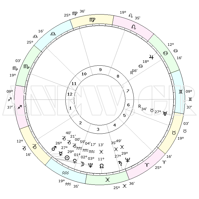 | | ΘΕΣΕΙΣ ΠΛΑΝΗΤΩΝ ΑΣΤΡΟΛΟΓΙΚΟΥ ΧΑΡΤΗ ΤΗΣ ΣΤΙΓΜΗΣ ΑΥΤΗΣ | | | | Πλανήτης | Ζώδιο | Μοίρες | Δεκαήμ. | Σε οίκο | Απόκλιση | | Ακμές των οίκων | | Ηλιος | Αιγόκερως | 28°56' | Τρίτο | 3 | 20 S 22 | | 1ος | 19°40' | Σκορπιός | | Σελήνη | Υδροχόος | 01°13' | Πρώτο | 3 | 23 S 00 | | 2ος | 19°34' | Τοξότης | | Ερμής | Αιγόκερως | 27°14' | Τρίτο | 3 | 22 S 39 | | 3ος | 23°41' | Αιγόκερως | | Αφροδίτη | Υδροχόος | 01°53' | Πρώτο | 3 | 20 S 48 | | 4ος | 29°16' | Υδροχόος | | Αρης | Αιγόκερως | 26°37' | Τρίτο | 3 | 21 S 48 | | 5ος | 01°22' | Κριός | | Δίας | Καρκίνος | 18°57'R | Δεύτερο | 8 | 22 N 22 | | 6ος | 27°48' | Κριός | | Κρόνος | Ιχθείς | 27°34' | Τρίτο | 4 | 02 S 59 | | 7ος | 19°40' | Ταύρος | | Ουρανός | Ταύρος | 27°34'R | Τρίτο | 7 | 19 N 25 | | 8ος | 19°35' | Δίδυμοι | | Ποσειδώνας | Ιχθείς | 29°49' | Τρίτο | 4 | 01 S 17 | | 9ος | 23°41' | Καρκίνος | | Πλούτωνας | Υδροχόος | 03°17' | Πρώτο | 3 | 23 S 06 | | 10ος | 29°16' | Λέων | | Β. Δεσμός | Ιχθείς | 11°13' | Δεύτερο | 4 | 07 S 21 | | 11ος | 01°22' | Ζυγός | | Ωροσκόπος | Σκορπιός | 19°40' | Δεύτερο | | | 12ος | 27°48' | Ζυγός | | Μεσουράνημα | Λέων | 29°16' | Τρίτο | | | |