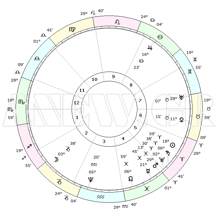 | | ΘΕΣΕΙΣ ΠΛΑΝΗΤΩΝ ΑΣΤΡΟΛΟΓΙΚΟΥ ΧΑΡΤΗ ΤΗΣ ΣΤΙΓΜΗΣ ΑΥΤΗΣ | | | | Πλανήτης | Ζώδιο | Μοίρες | Δεκαήμ. | Σε οίκο | Απόκλιση | | Ακμές των οίκων | | Ηλιος | Κριός | 18°54' | Δεύτερο | 6 | 07 N 24 | | 1ος | 00°03' | Σκορπιός | | Σελήνη | Αιγόκερως | 02°49' | Πρώτο | 3 | 28 S 06 | | 2ος | 28°28' | Σκορπιός | | Ερμής | Ιχθείς | 21°40' | Τρίτο | 5 | 05 S 21 | | 3ος | 00°26' | Αιγόκερως | | Αφροδίτη | Ταύρος | 11°10' | Δεύτερο | 7 | 15 N 04 | | 4ος | 04°37' | Υδροχόος | | Αρης | Ιχθείς | 29°10' | Τρίτο | 5 | 01 S 16 | | 5ος | 07°32' | Ιχθείς | | Δίας | Καρκίνος | 16°22' | Δεύτερο | 9 | 22 N 48 | | 6ος | 06°12' | Κριός | | Κρόνος | Κριός | 06°37' | Πρώτο | 6 | 00 N 40 | | 7ος | 00°03' | Ταύρος | | Ουρανός | Ταύρος | 29°07' | Τρίτο | 8 | 19 N 47 | | 8ος | 28°28' | Ταύρος | | Ποσειδώνας | Κριός | 02°30' | Πρώτο | 5 | 00 S 13 | | 9ος | 00°25' | Καρκίνος | | Πλούτωνας | Υδροχόος | 05°20' | Πρώτο | 4 | 22 S 47 | | 10ος | 04°37' | Λέων | | Β. Δεσμός | Ιχθείς | 06°60' | Πρώτο | 4 | 08 S 56 | | 11ος | 07°32' | Παρθένος | | Ωροσκόπος | Σκορπιός | 00°03' | Πρώτο | | | 12ος | 06°12' | Ζυγός | | Μεσουράνημα | Λέων | 04°37' | Πρώτο | | | |